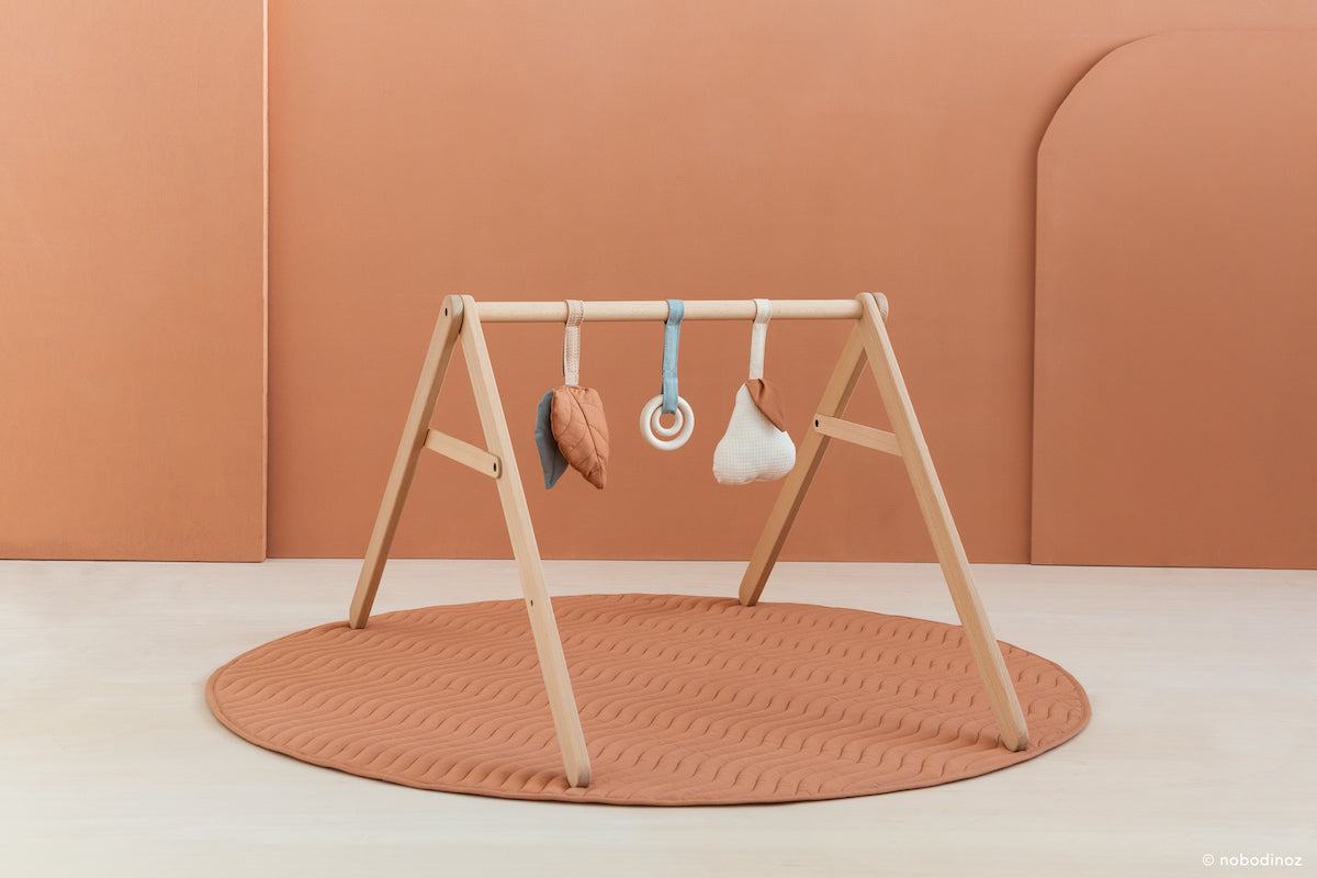 Help your baby discover the world with activity toys in organic cotton and solid maple wood to hang from the Activity Arch with Velcro straps: you can adjust their height as you want!