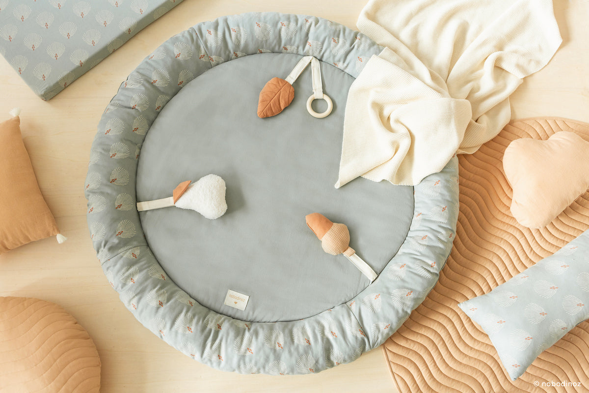 The new baby activity nest is perfect for your kids to develop their senses on their own, comfortably laying on this padded playmat. It offers various sensory activities: the crinkly leaf, the acorn-shaped rattle, the maple ring and the pear with honeycomb texture. Its edge is extra padded, so that your child does not go out of the activity nest.