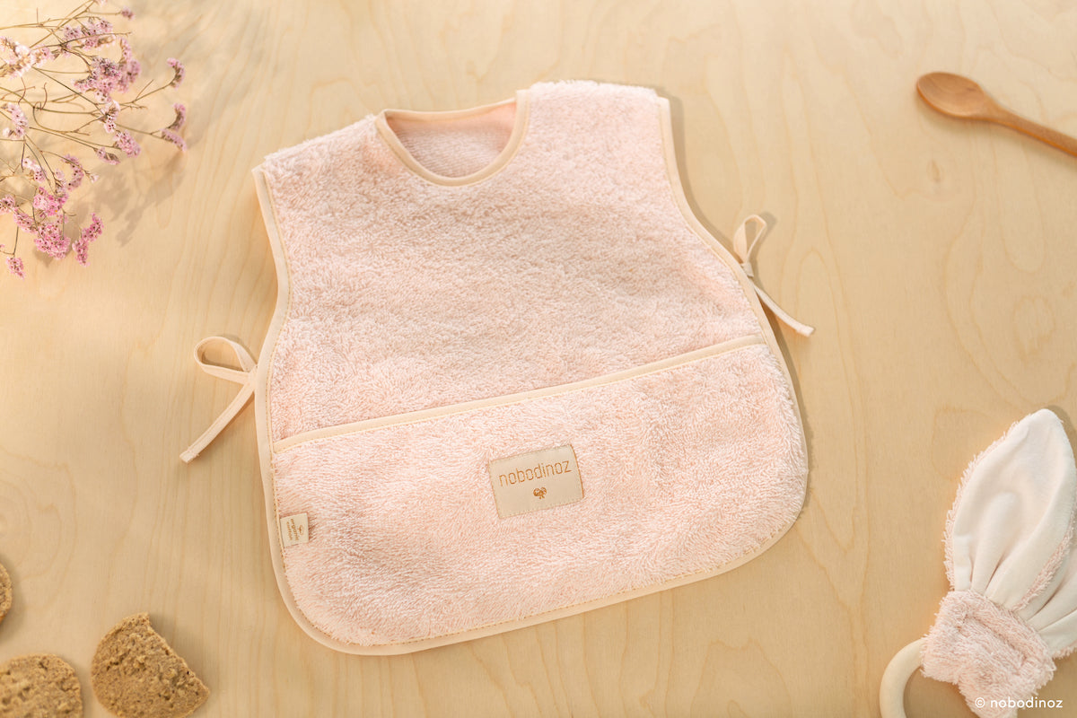 With the So Cute apron bib, your baby can have lunch at the dinner table with you and keep clean. Its interior pocket catches the food residues and its terry fabric is easy to clean. It's also easy to put and take off your baby, thanks to side ties or to the practical velcro strap on the neck side.