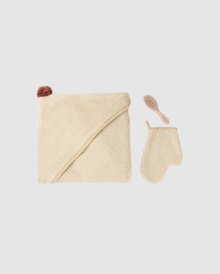 This extra-soft organic cotton terry bath set is the perfect baby bith gift. A complete set with three essentials from the So Cute line: the bath cape, the baby wash mitt and the ultra-soft natural hairbrush. A comfortable experience, essential for gently pampering baby after bath time.