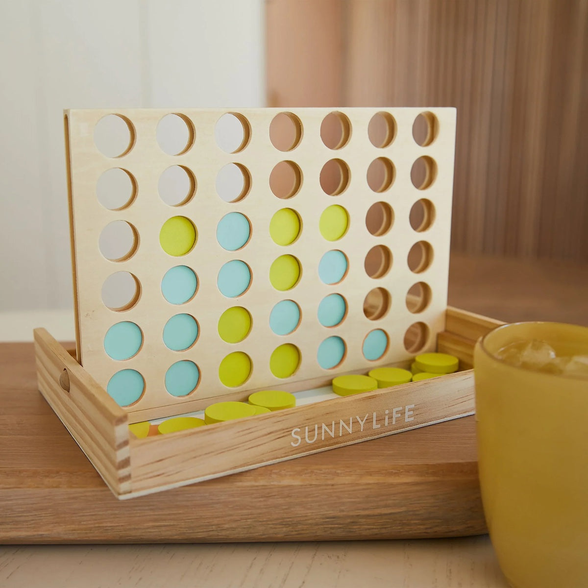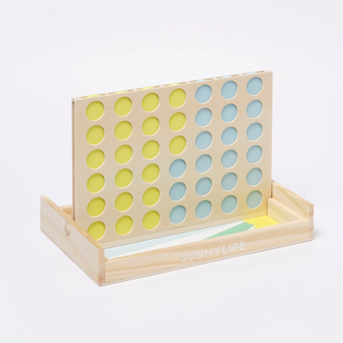 Take Me Anywhere! Transforming into its own wooden carry case, this travel-size mini is made for adventures. Get back to basics with a classic game set made from natural wood. Featuring a bold sunburst interior print and a confectionary colour scheme, the Pastel Gelato mini 4-in-a-row set is made for playing the day away in style, no matter where life takes you.