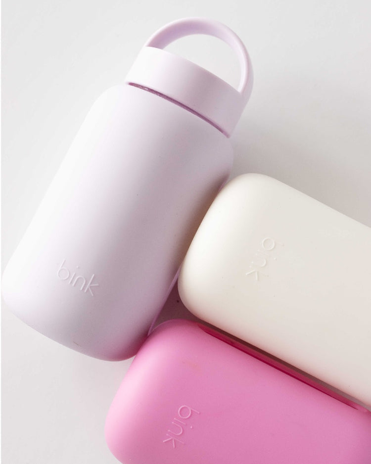 Minimalískar og stílhreinar vatnsflöskur frá Bink úr gleri og sílikoni. Með víðu opi sem gott er að drekka úr og auðvelt að fylla með klökum.
