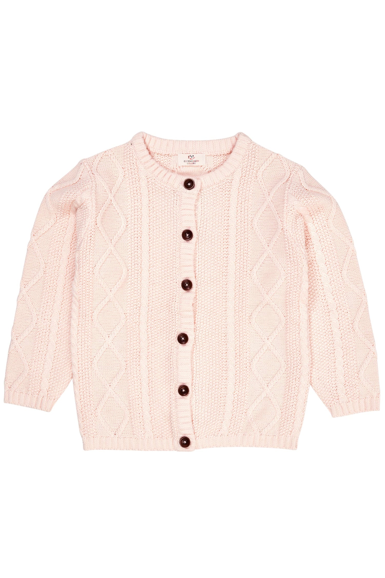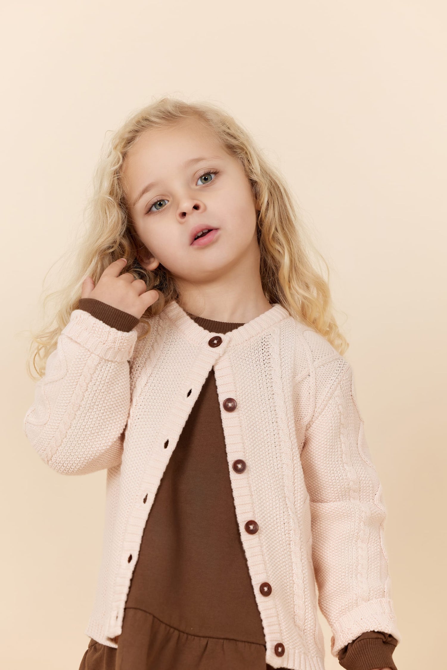 Fully fashioned and cozy cable knitted cardigan is an absolute classic! The cardigan is made from 100% organic cotton with sustainable buttons made of corozo nuts. The organic cotton makes it easy for your munchkin to acclimatize in every weather. And don't you worry - this sweater can easily be wash in the washing machine without losing shape.