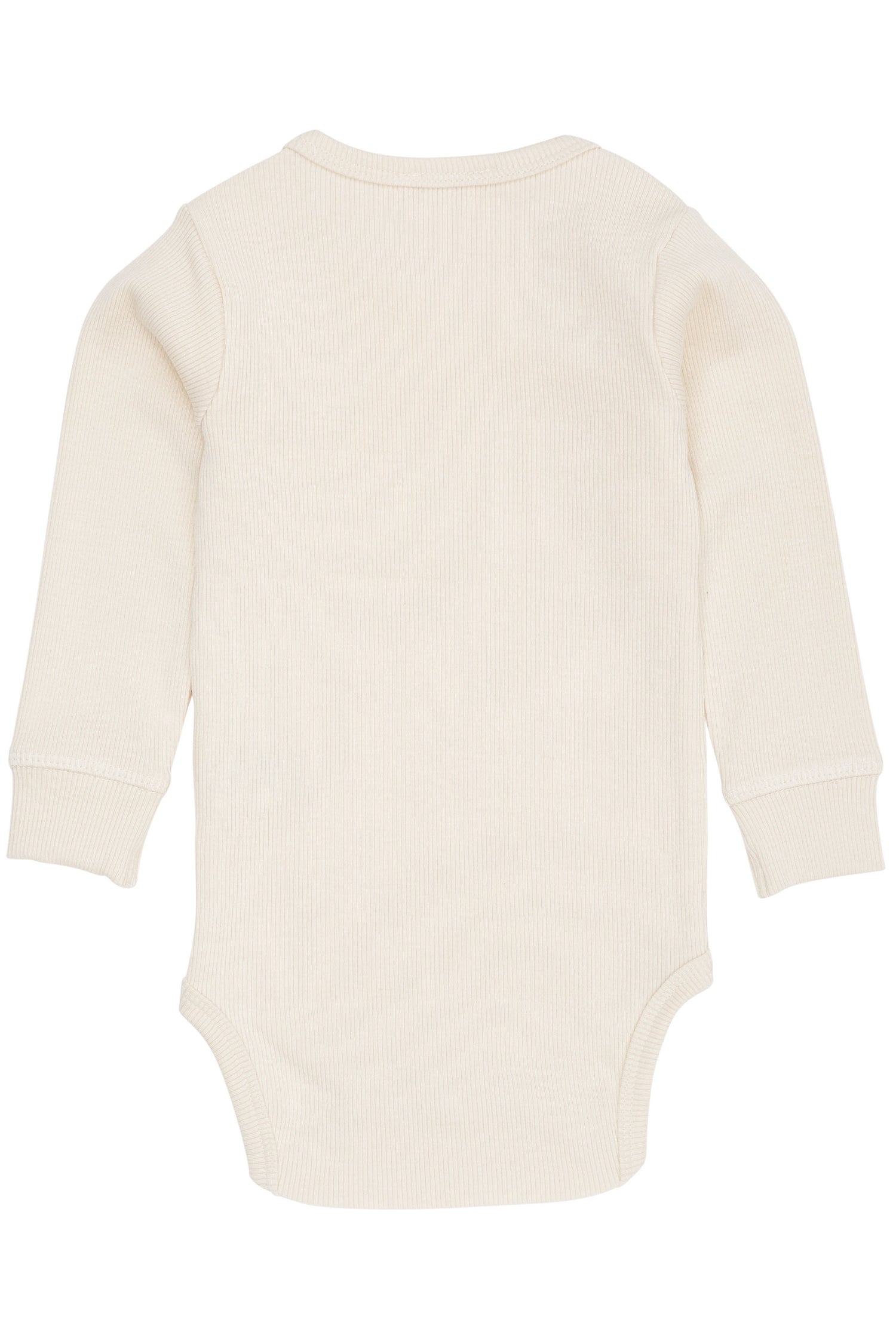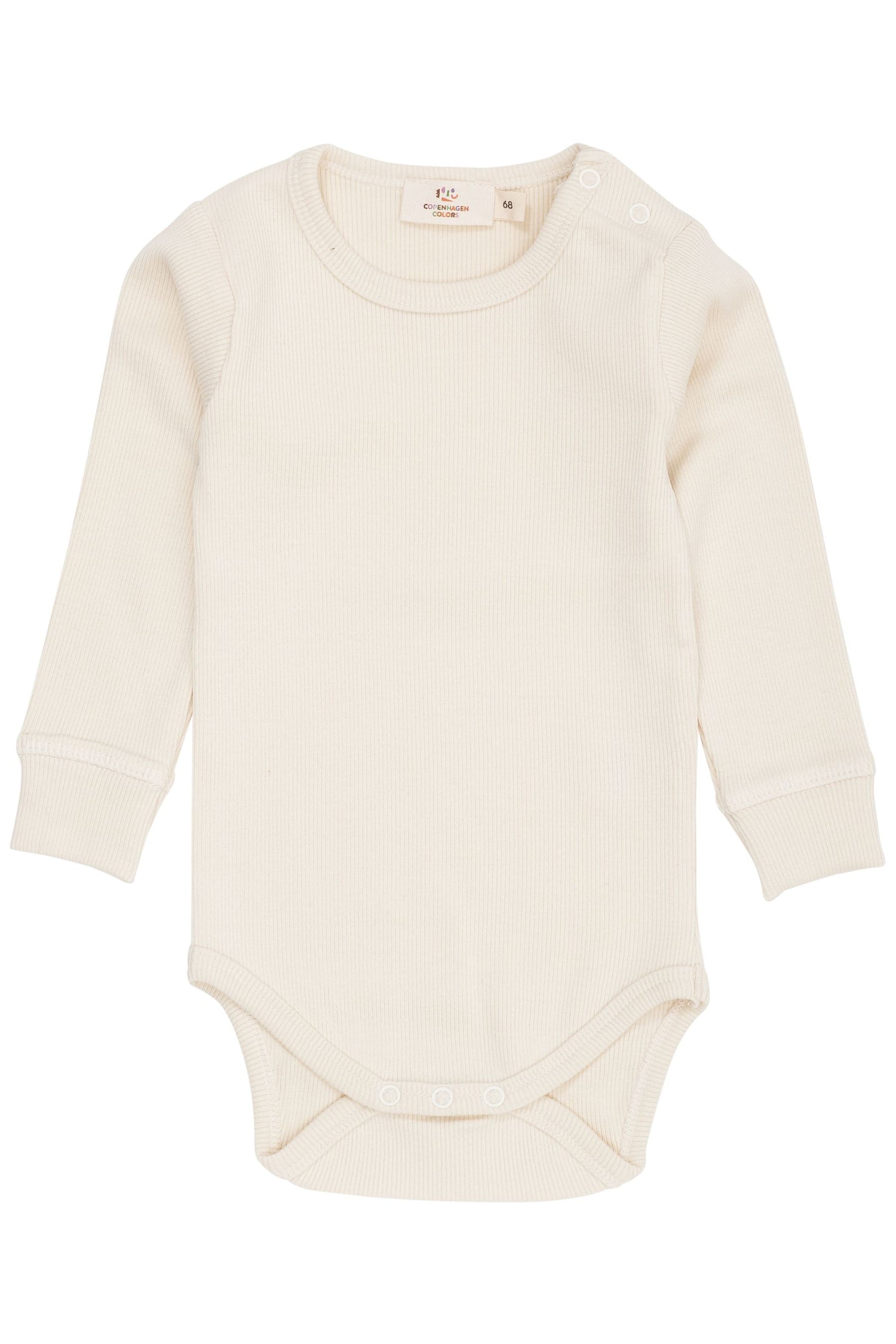 This ribbed modal bodysuit features snap closures between the legs. It has long sleeves and a round neckline.