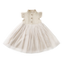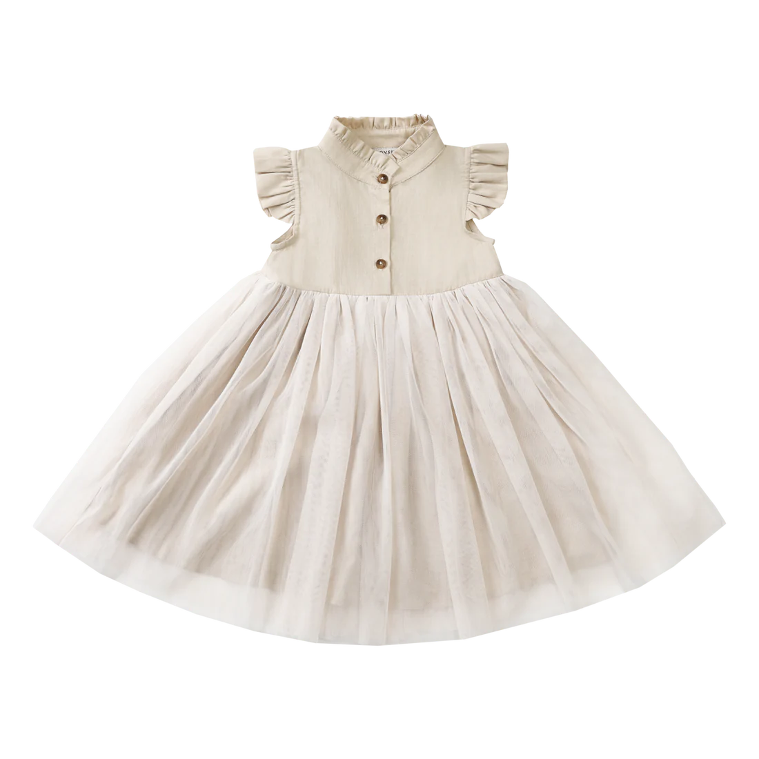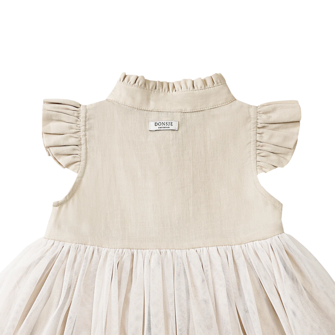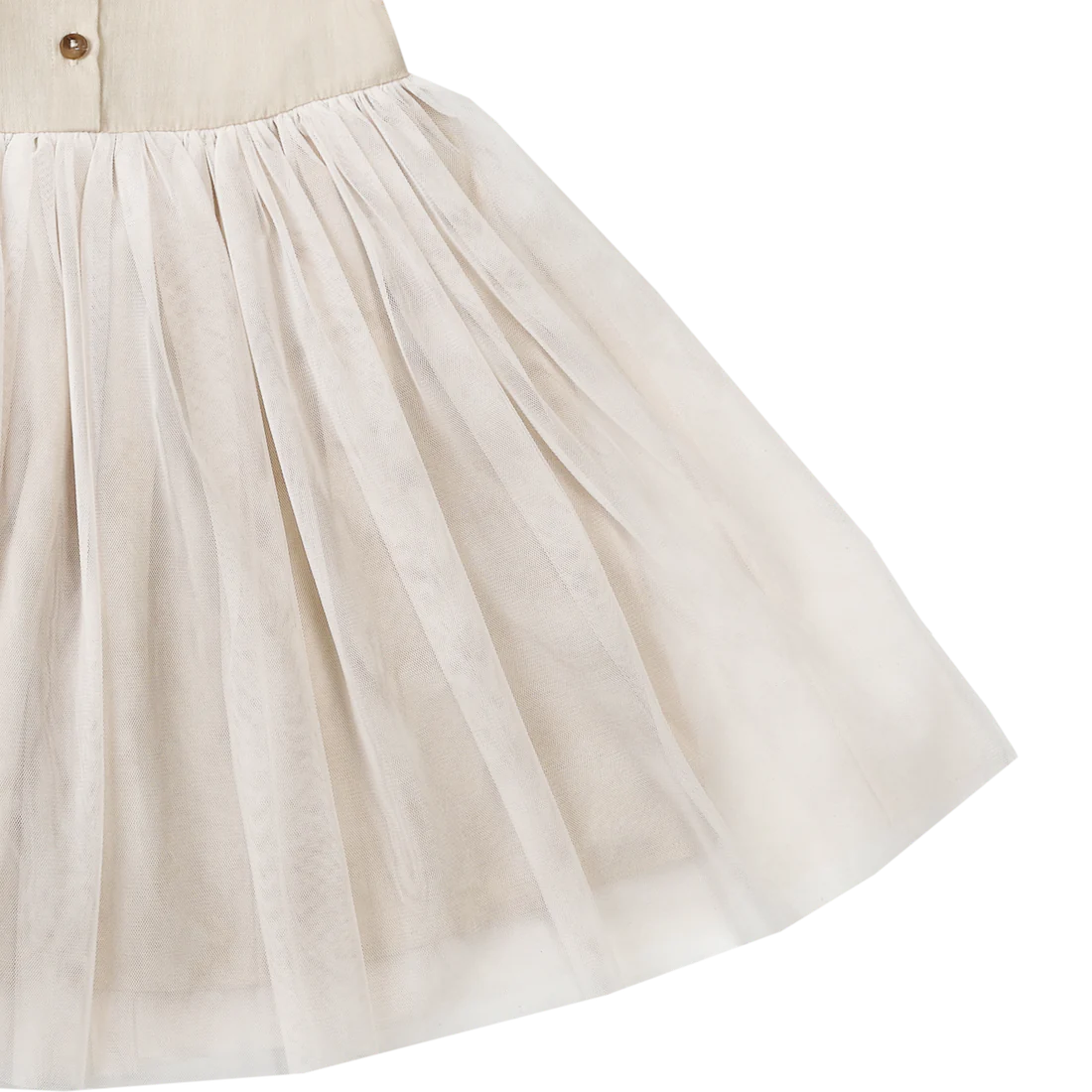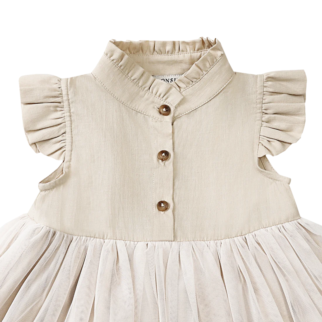 Modern princess! Made from breathable cotton and layered with weightless tulle, the Fleurance Dress features a beautiful ruffled collar and delicate butterfly sleeves—a dreamy creation worthy of every modern princess. Ideal for summer festivities and joyful celebrations.