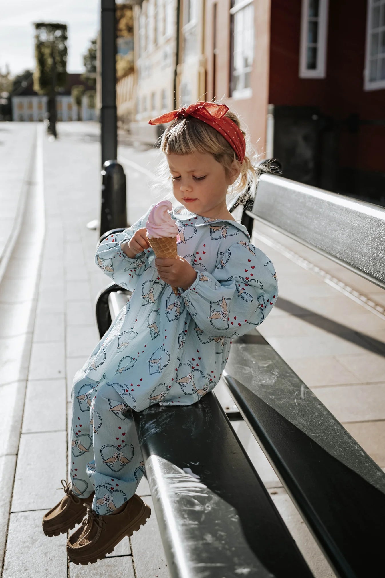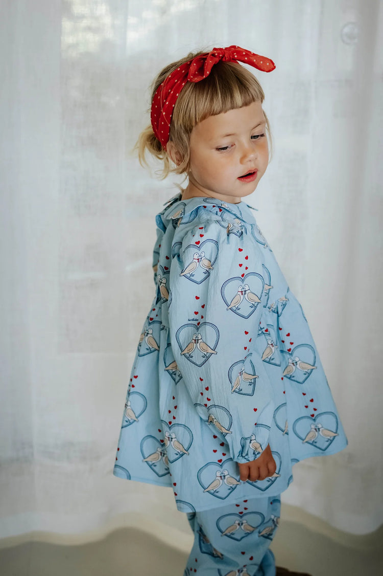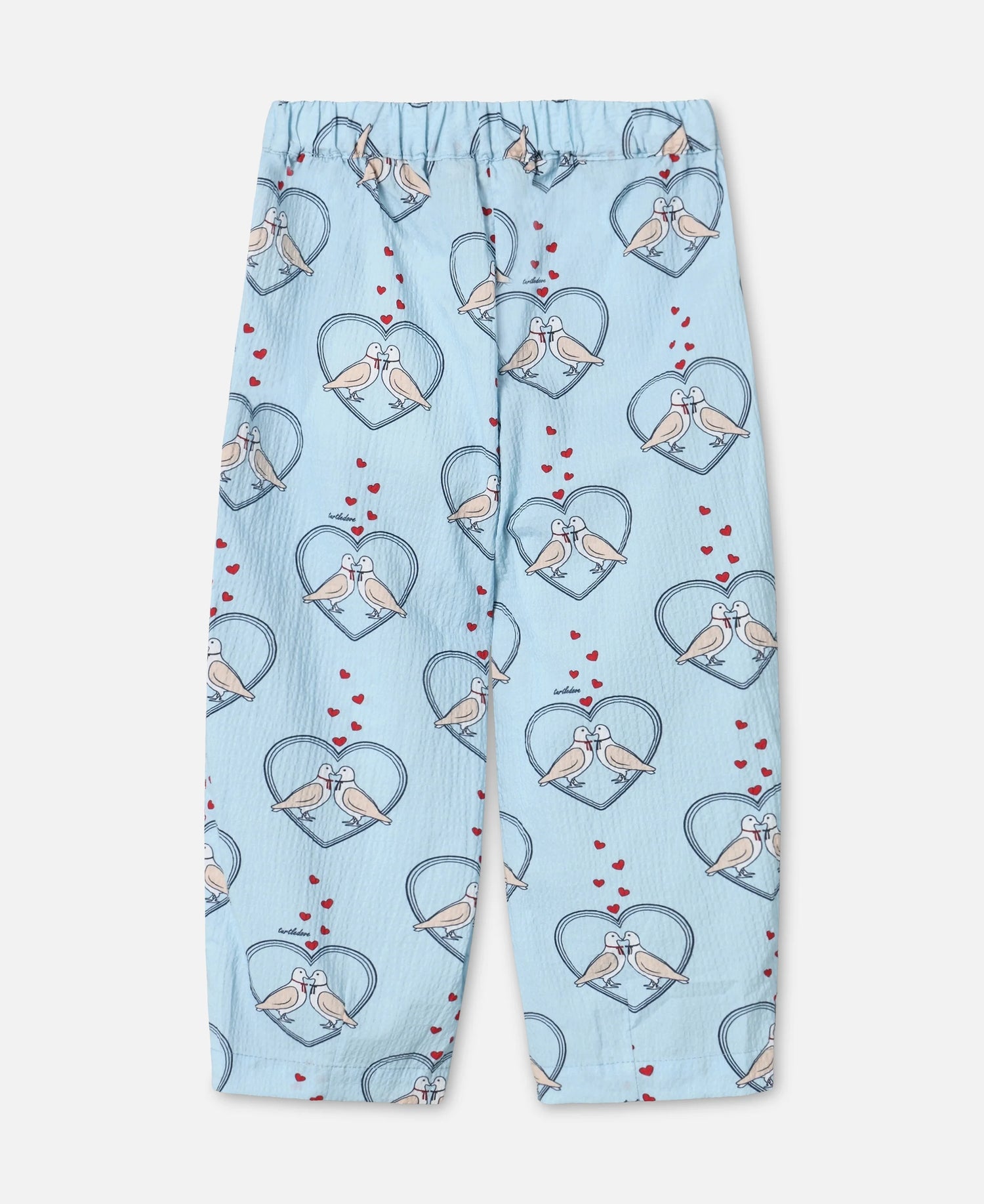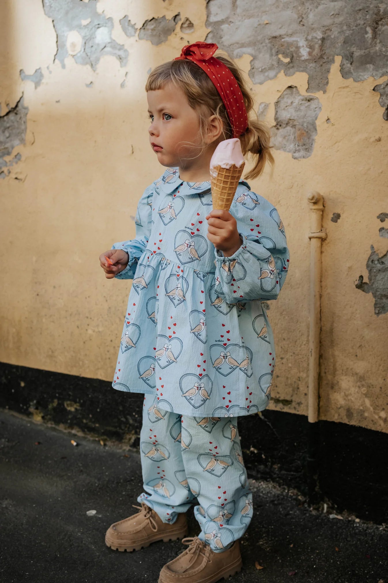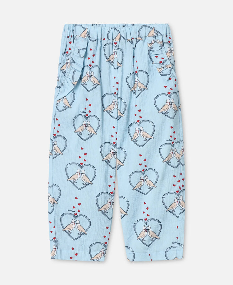Trousers in a soft printed quality with structure. The trousers have an elastic waist and side pockets with a nice ruffle detail. The trousers reach the ankles and have a loose fit that makes them comfortable to wear. The name Colombe is French and means dove, as the print consists of two doves sitting in a heart.