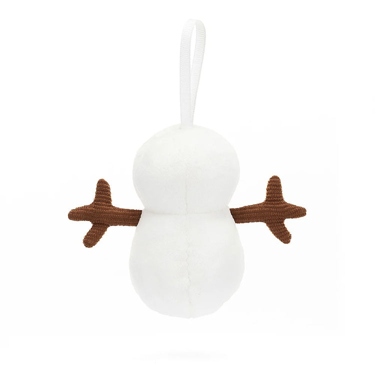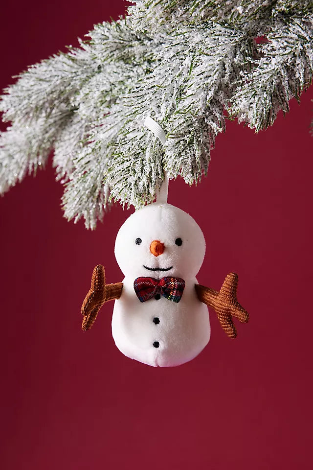 Festive Folly Snowman is marshmallow-soft in gentle cream fur. This playful tree pal has a tartan bow-tie, stitched coal buttons and suedette carrot nose. With a snowy ribbon for hanging on the tree and chocolate cord arms held wide for hugs, this snowman is anything but frosty!