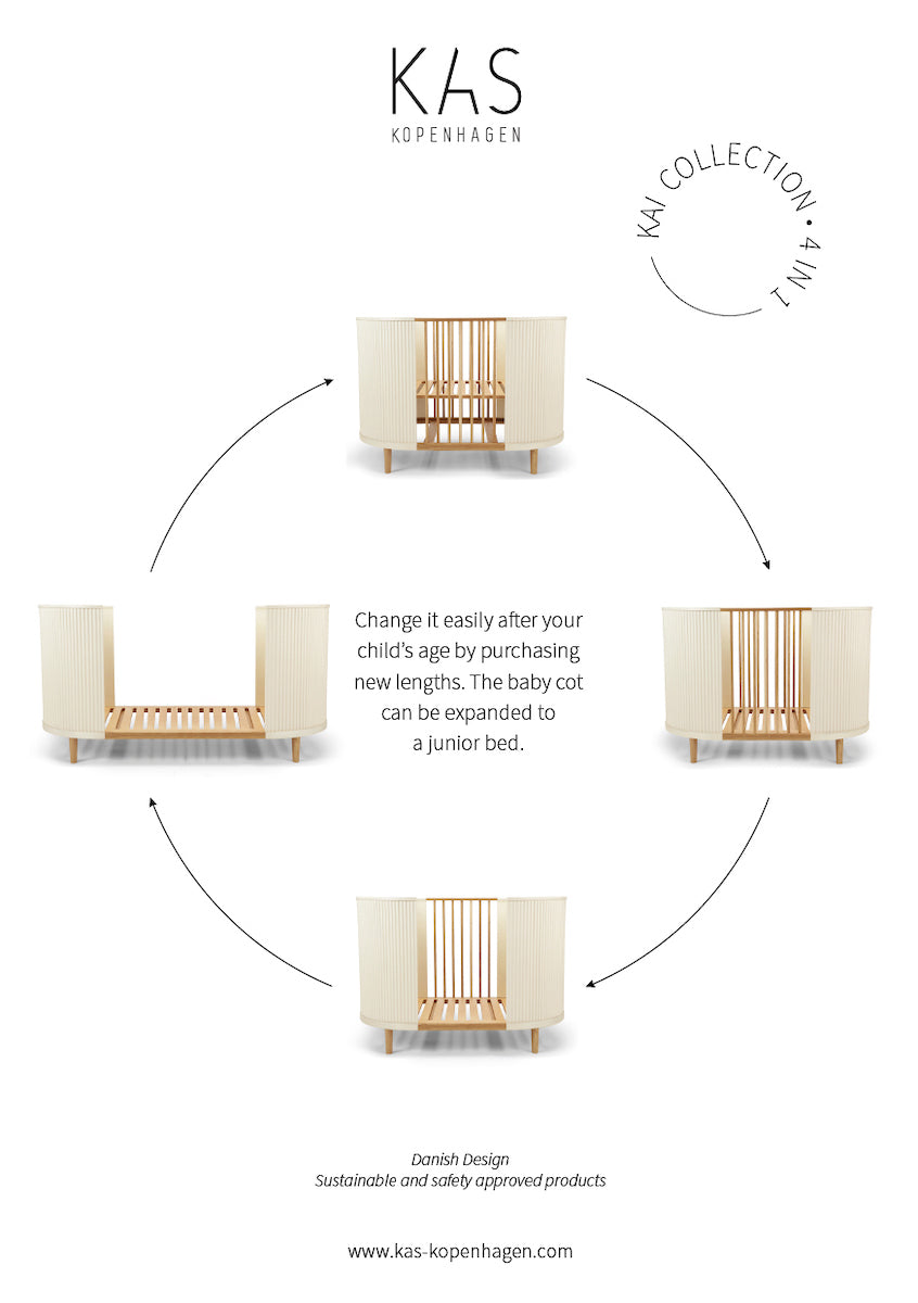 Eftir því sem barnið stækkar er fljótt og auðvelt að fjarlægja báðar hliðar barnarúmsins og kaupa framlengingardýnu þá breytist barnarúmið í "unglingarúm" og hefur margra ára notagildi.