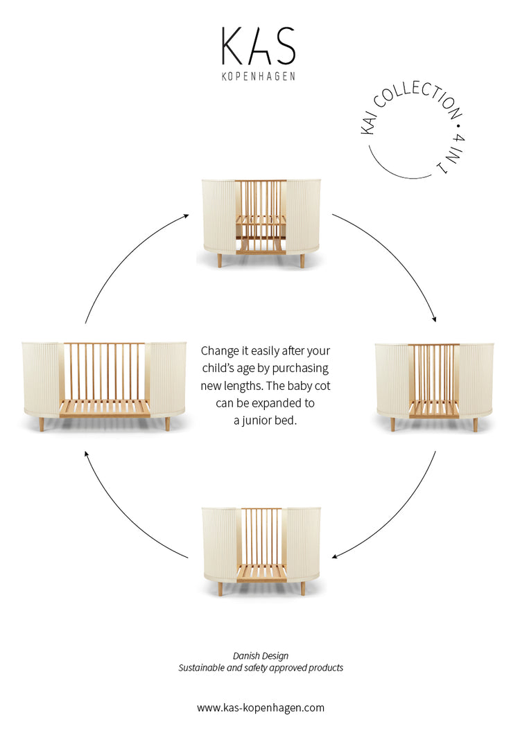 When the child grows out of the cot, you can quickly and easily remove the side base and bag of the bag gable, and add the extension set, so that the bed becomes 150 cm long and follows the child for several years.