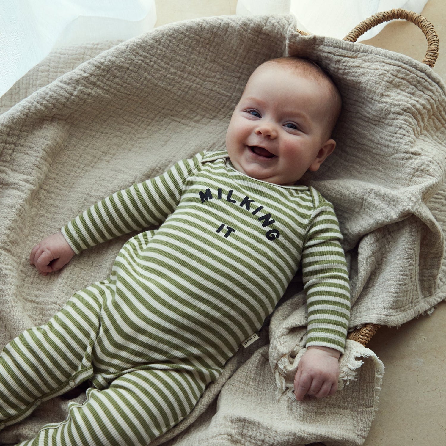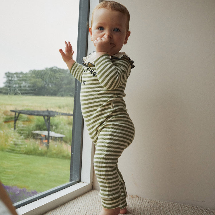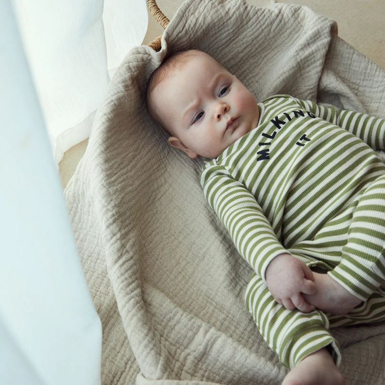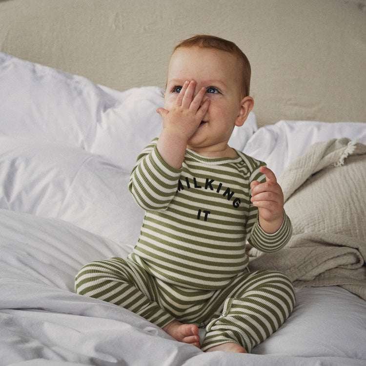 This Milking It Stripe Onesie is made with 97% organic cotton and 3% elastane rib for ultimate softness and stretch. The envelope neckline and popper fastening make it easy to change your little one. Unisex and stylish with a playful striped design. Comfort and convenience for both baby and parents.