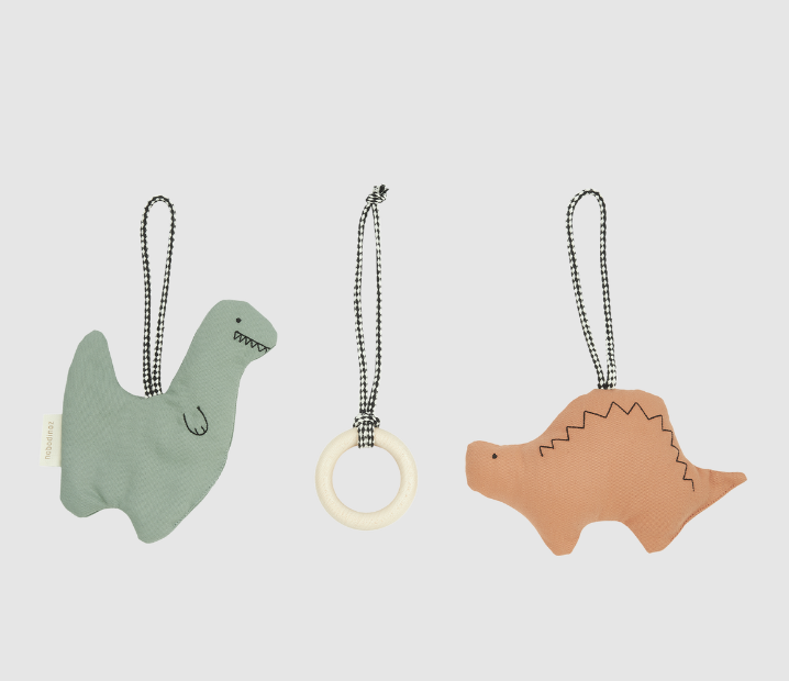 You'll love these sensory toys in the shape of dinosaurs. Adjust the height of the activity toys as you like on your Growing Green arch or over your pushchair barrier: different shapes and textures will stimulate your child's senses and help them: