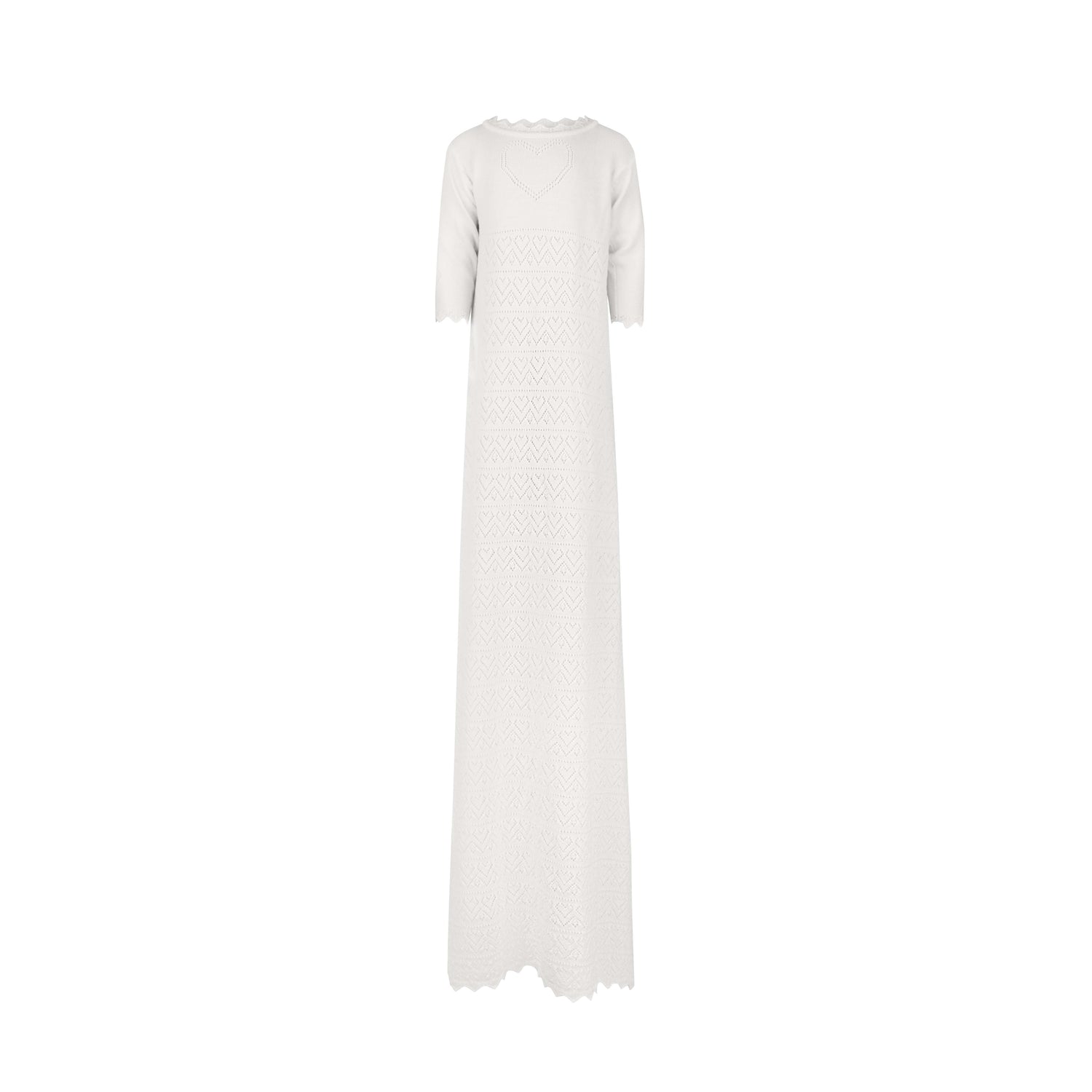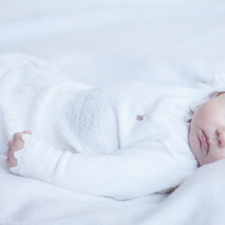 Beautiful christening dress / baptism dress for boys and girls in soft Merino wool. The dress has a lovely heart shaped pattern, and matches with the Christening hat. The dress measures 104 cm in size 68. There are small loops on the side where you can fasten a silk ribbon.