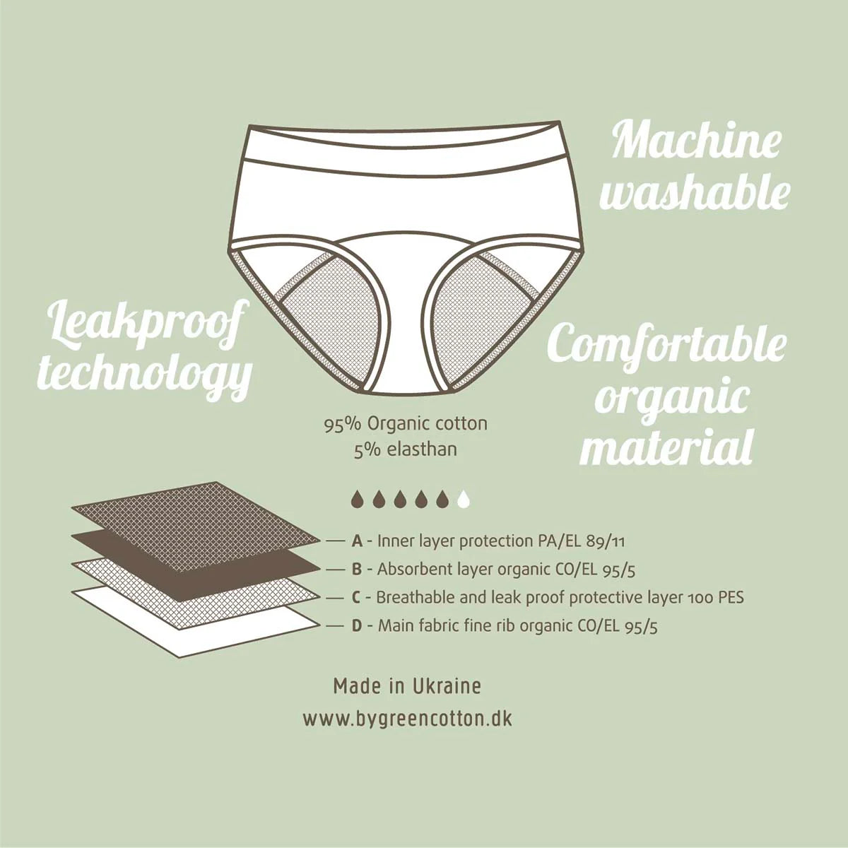 The period underwear are is washable, reusable, and made of a soft cotton jersey from 95% organic cotton and 5% Lycra in a comfortable fit.