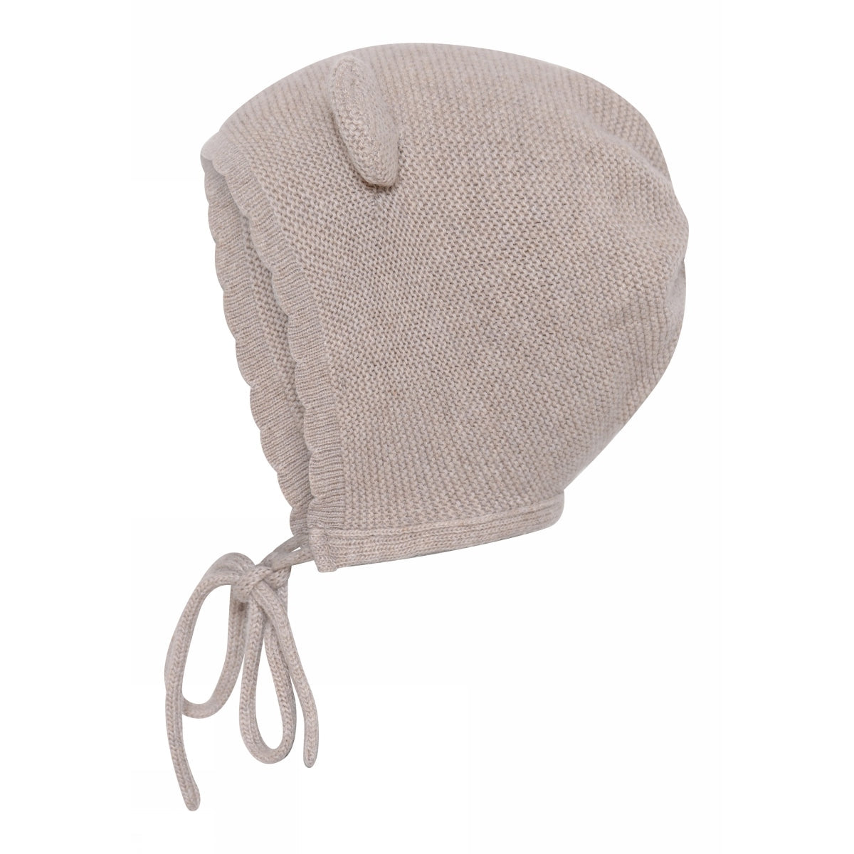 The hat features a decorative picot edge, small ears on the top, and tie strings under the chin for optimal fit.