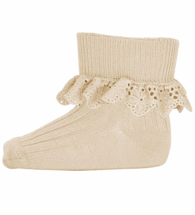 Sweet MP socks in beige with a fine rib structure and a nice lace at the top.