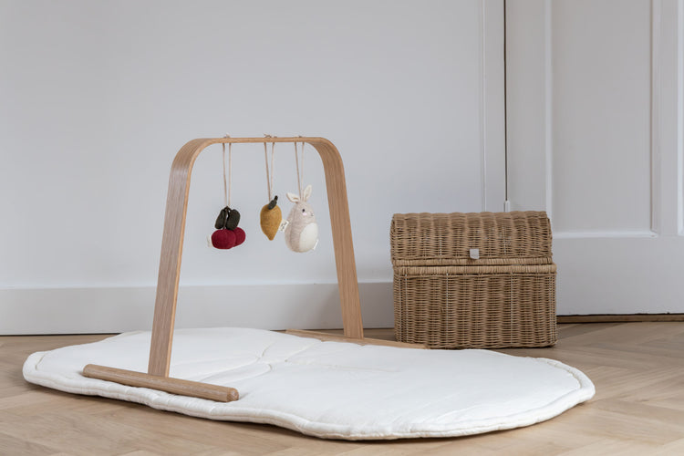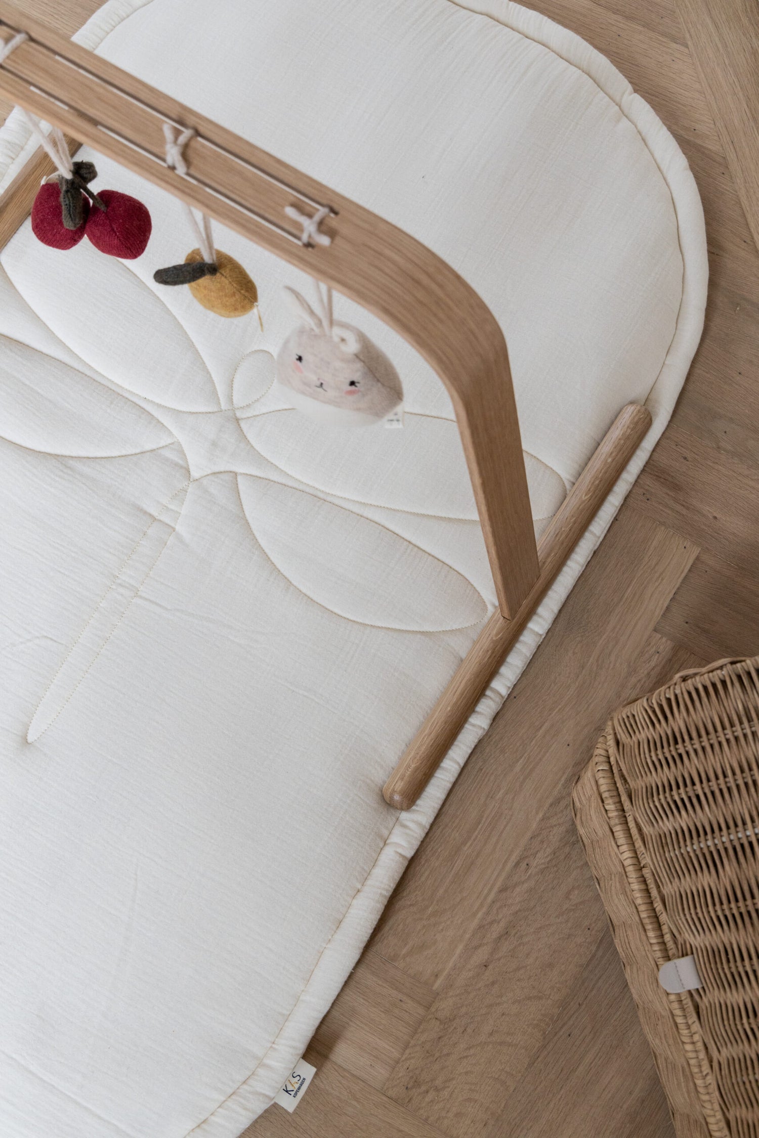 This beautiful oval playmat, made from organic muslin cotton, is perfect for creating a soft and comfortable play area on the floor.