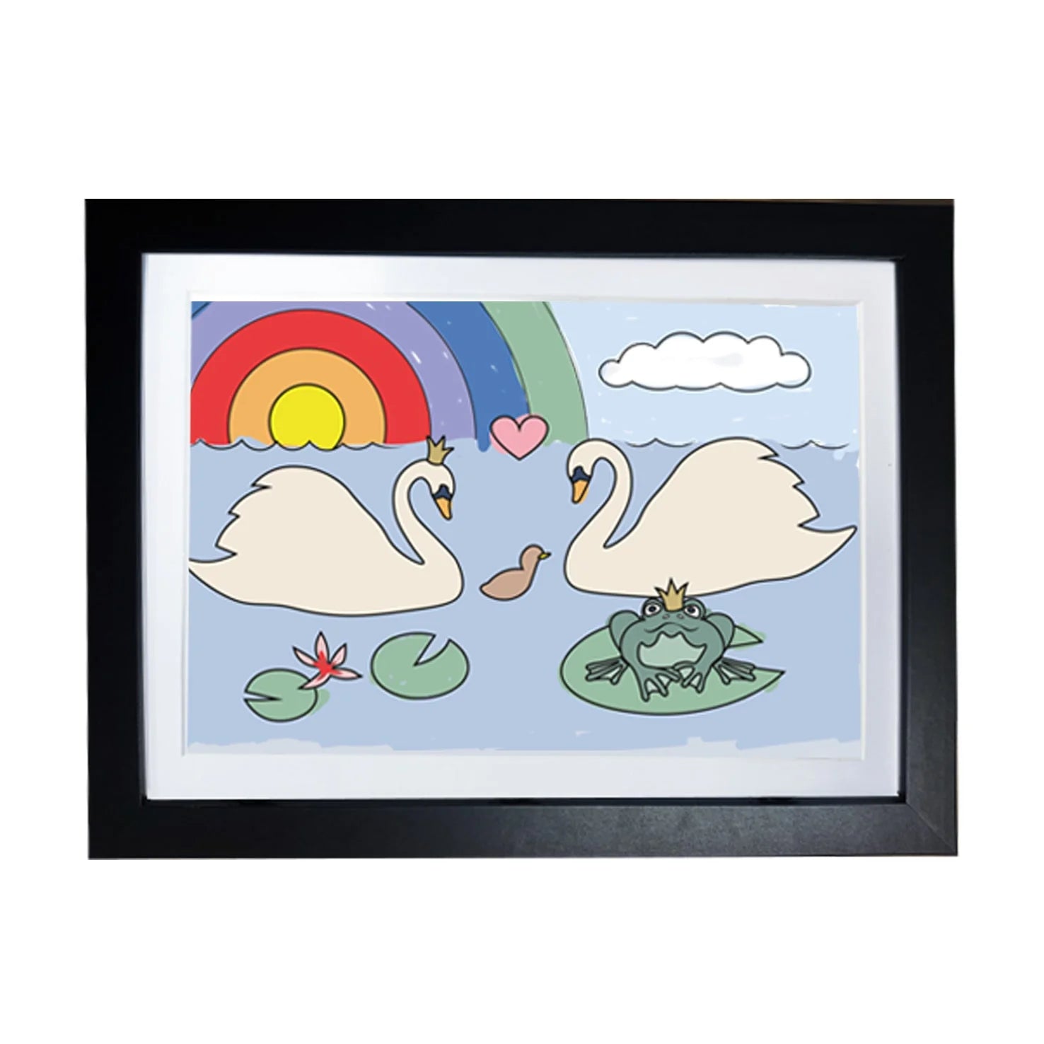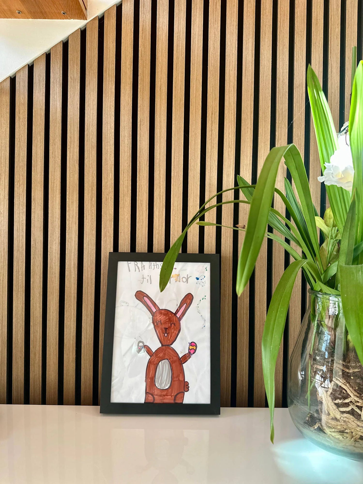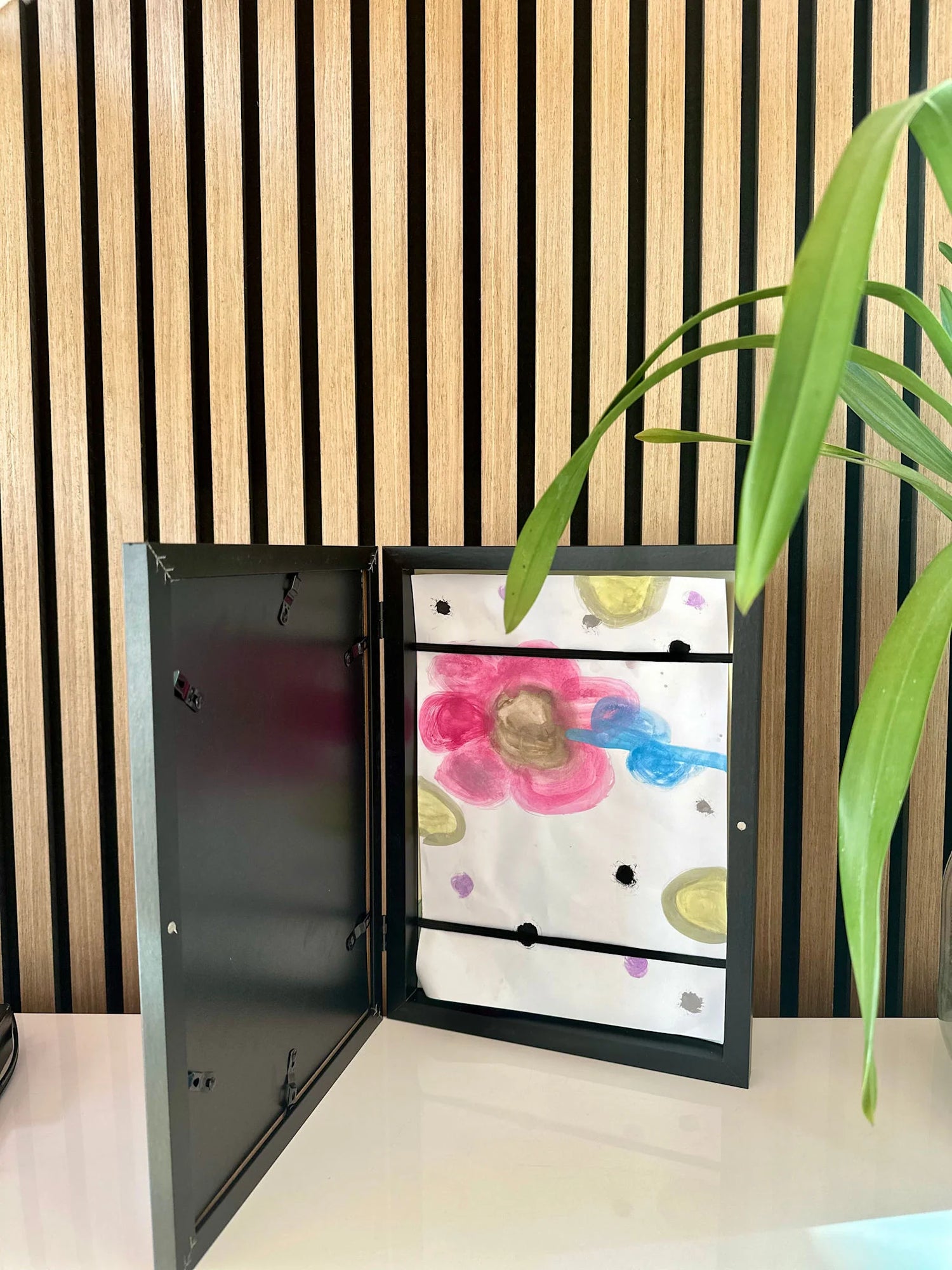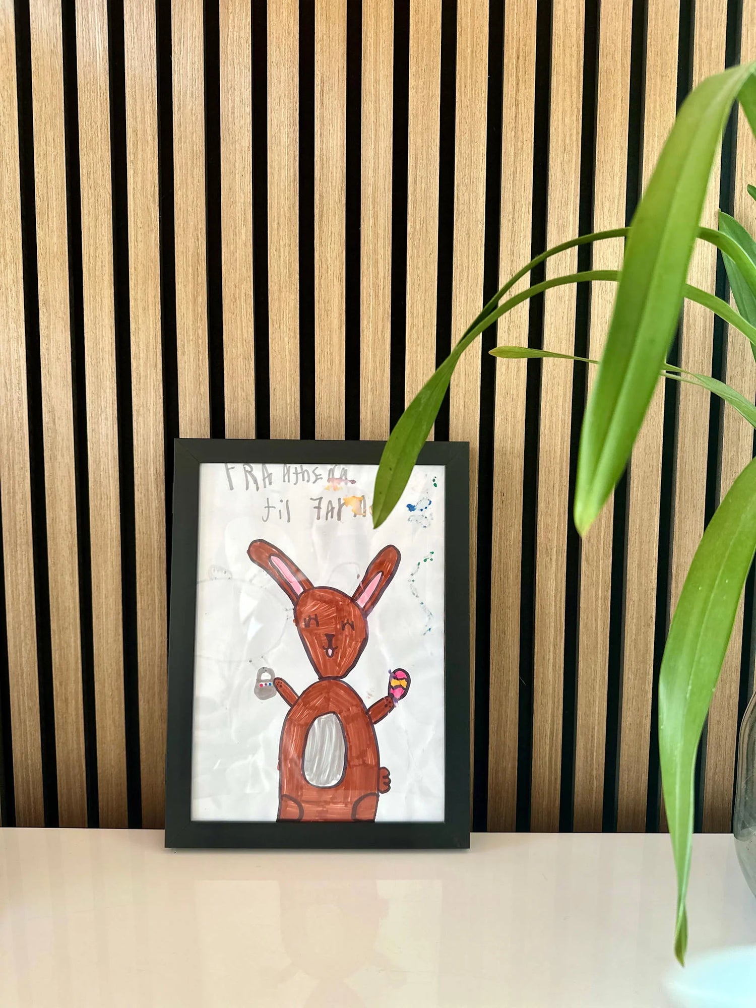 This gallery frame from Vanilla Copenhagen is perfect for framing your children's drawings and paintings. The frame can hold up to 80 drawings in A4 format. It has a magnetic closure in the front, making it easy to insert the drawings. The drawings that are not displayed can be stored behind the frame using two elastic bands. The frame has two hanging hooks on the back, so it can be hung both horizontally and vertically. The frame is made of MDF wood and has an acrylic panel that does not splinter like glass, making it suitable for a child's room.