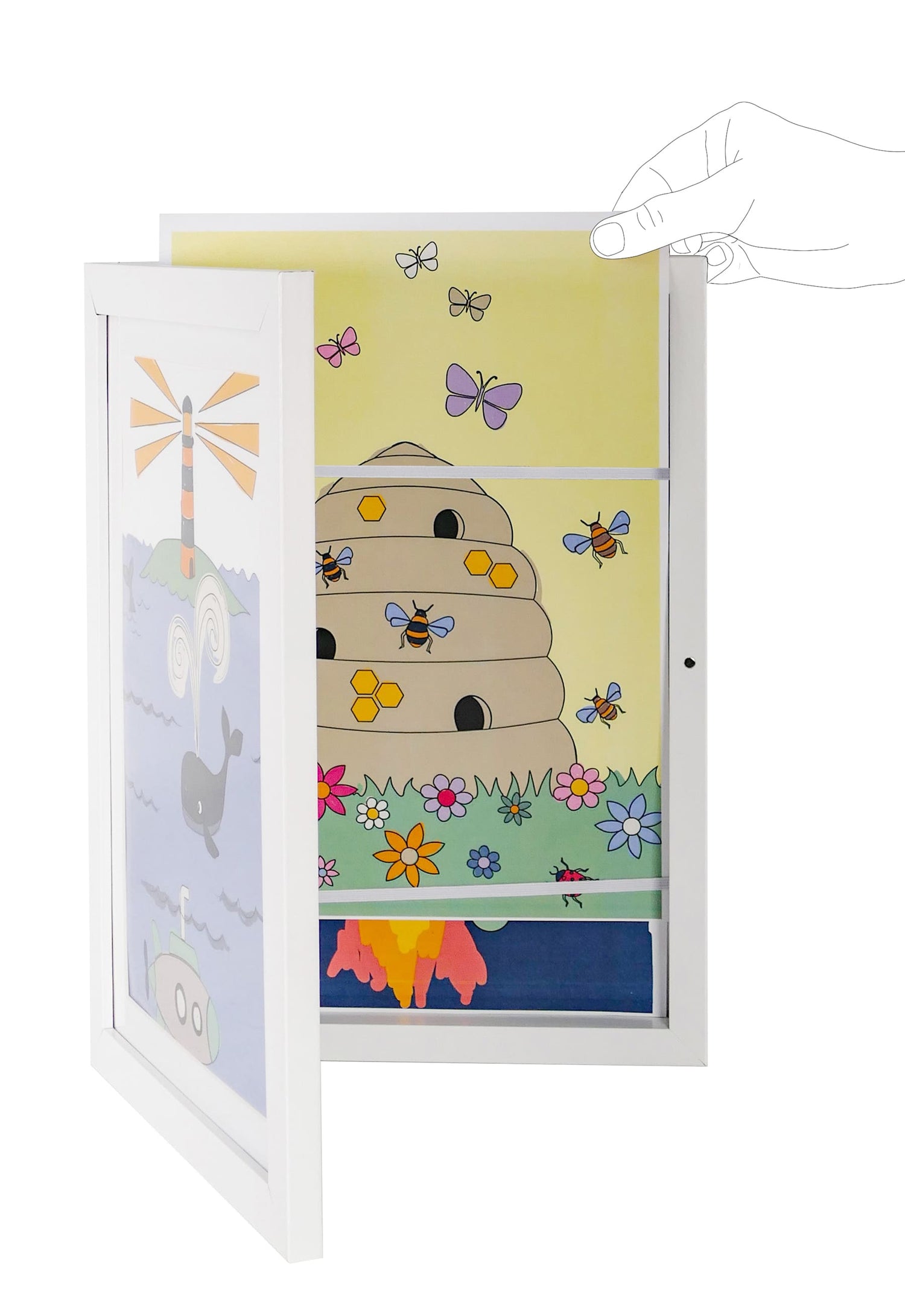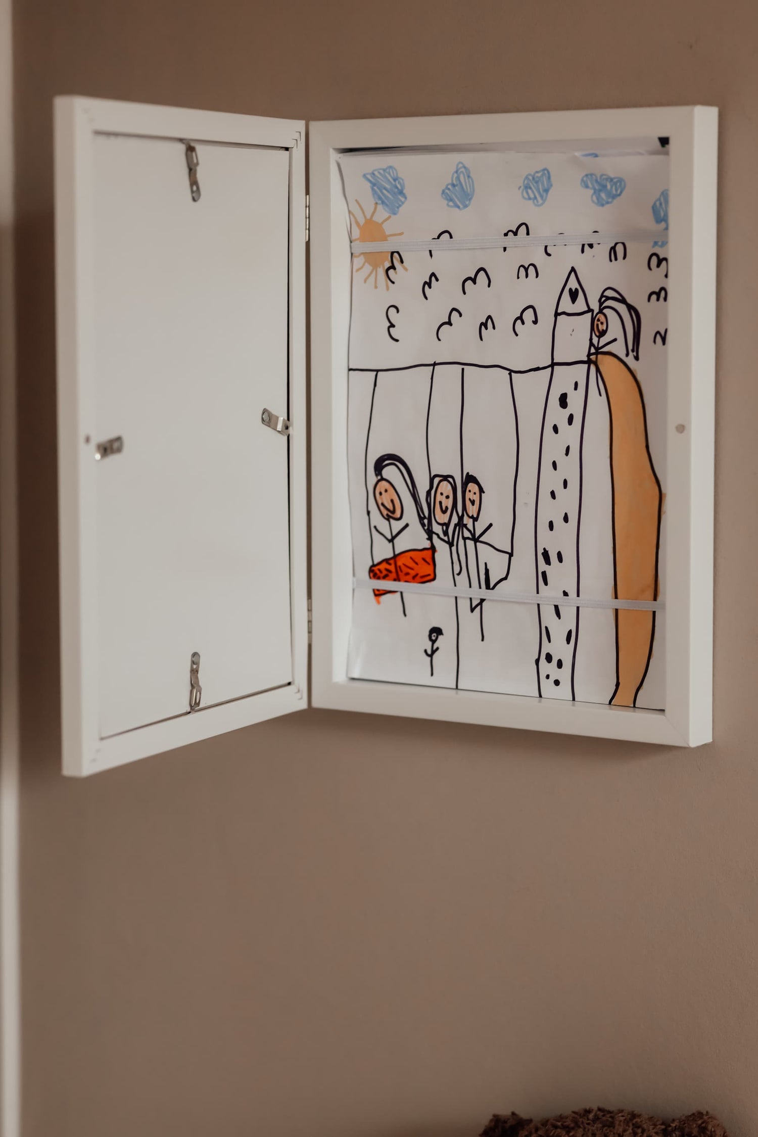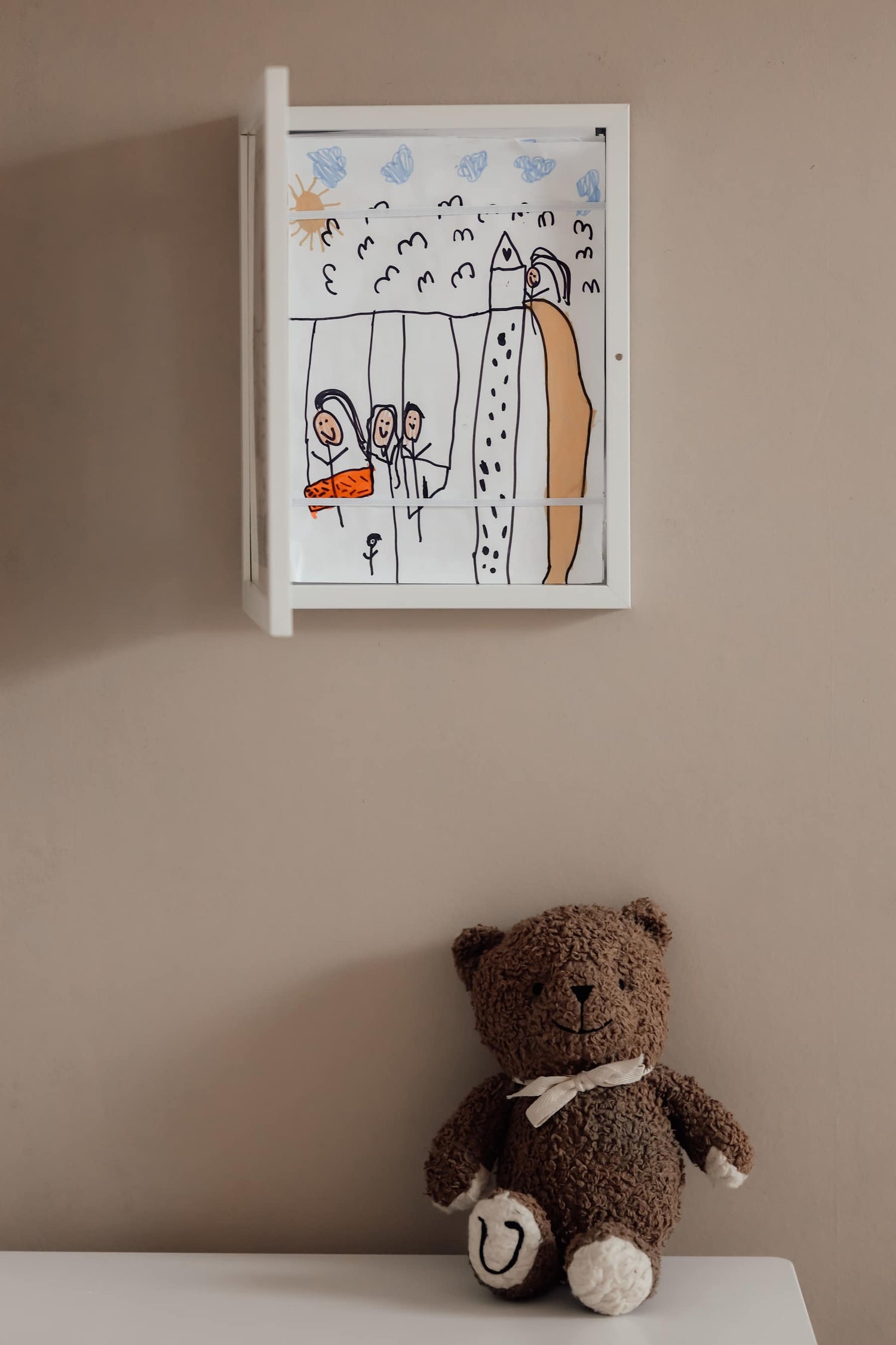 This gallery frame from Vanilla Copenhagen is perfect for framing your children's drawings and paintings. The frame can hold up to 80 drawings in A4 format. It has a magnetic closure in the front, making it easy to insert the drawings. The drawings that are not displayed can be stored behind the frame using two elastic bands. The frame has two hanging hooks on the back, so it can be hung both horizontally and vertically. The frame is made of MDF wood and has an acrylic panel that does not splinter like glass, making it suitable for a child's room.