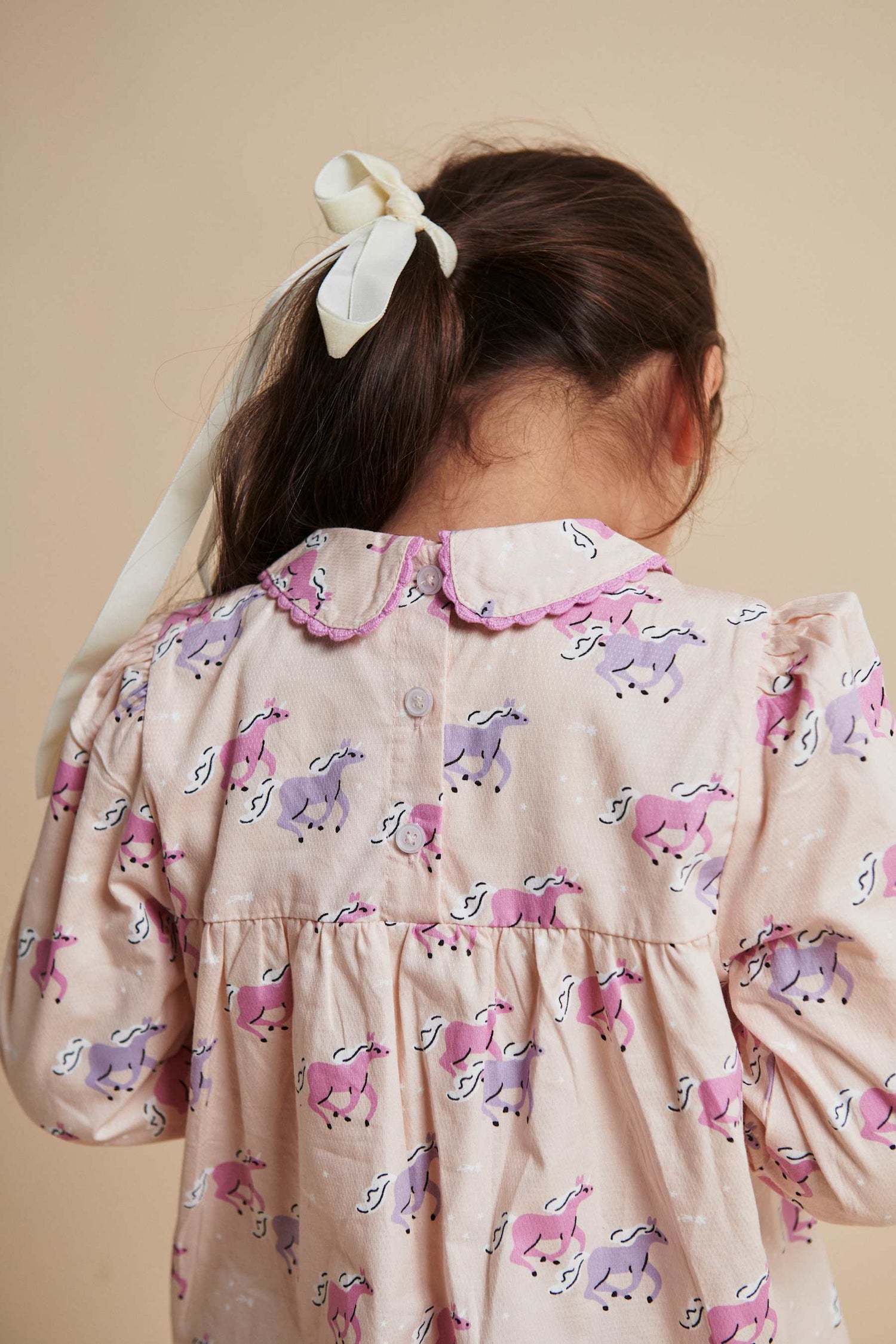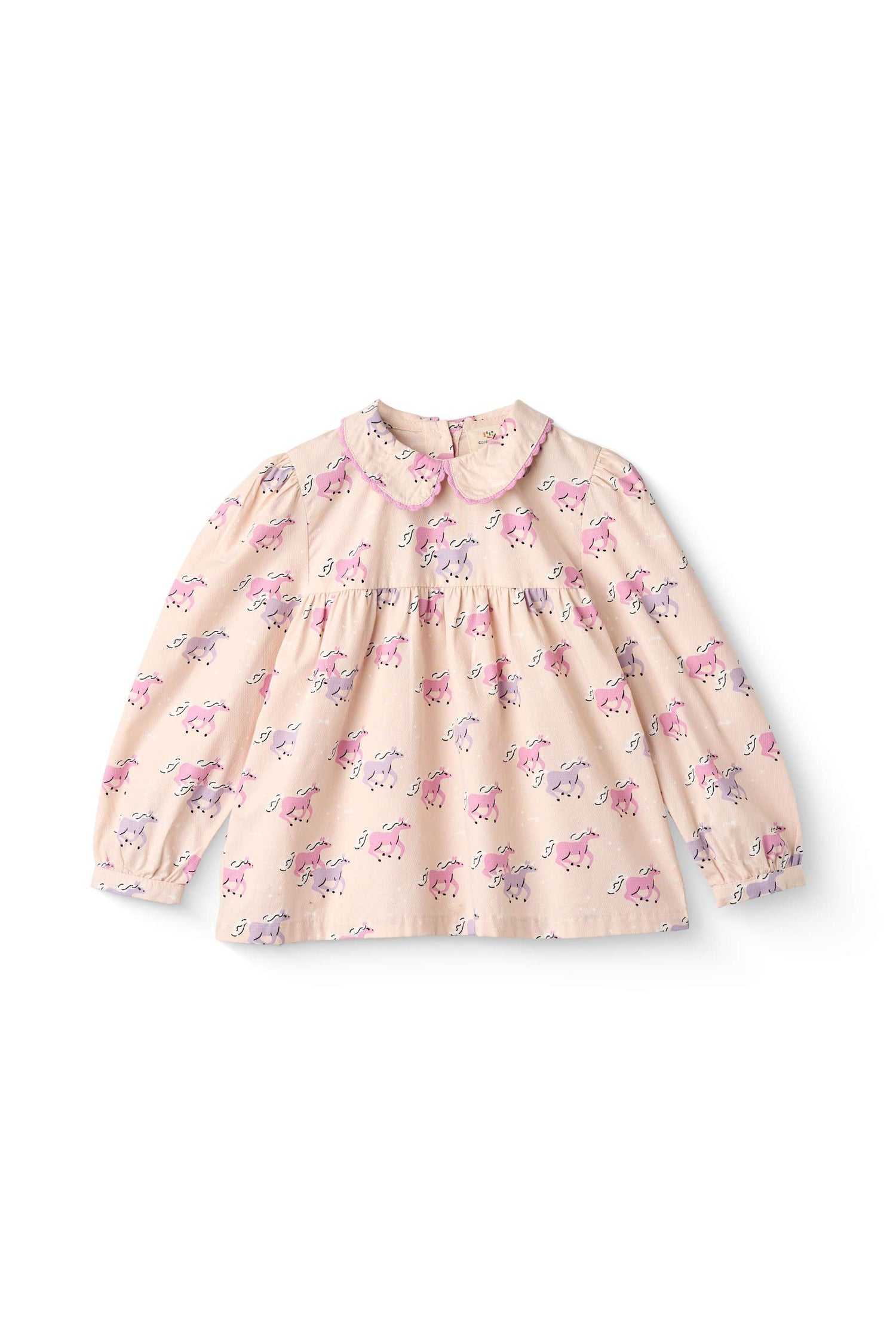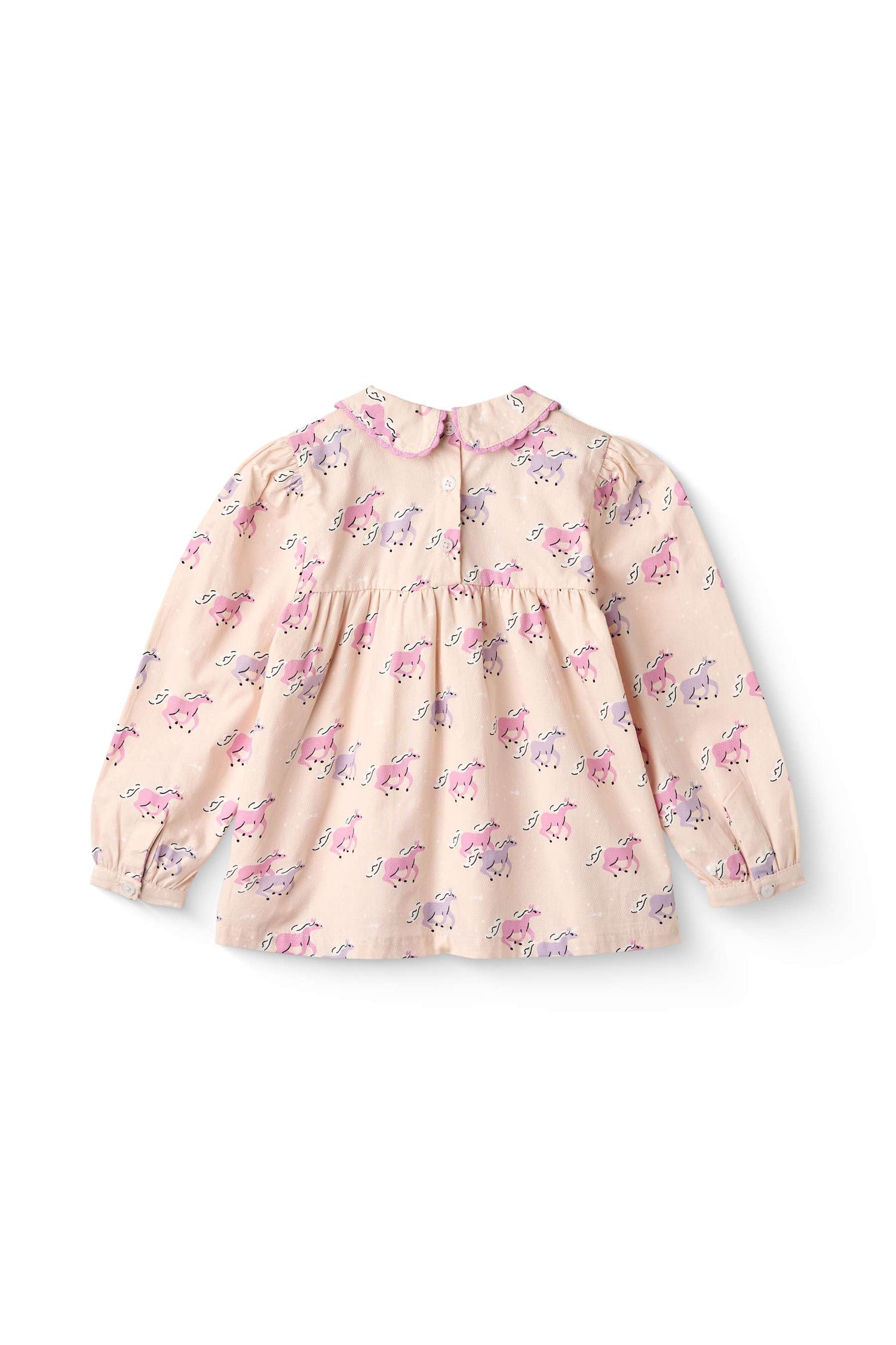 This blouse has an all over unicorn print. The blouse is made of 100 % organic cotton