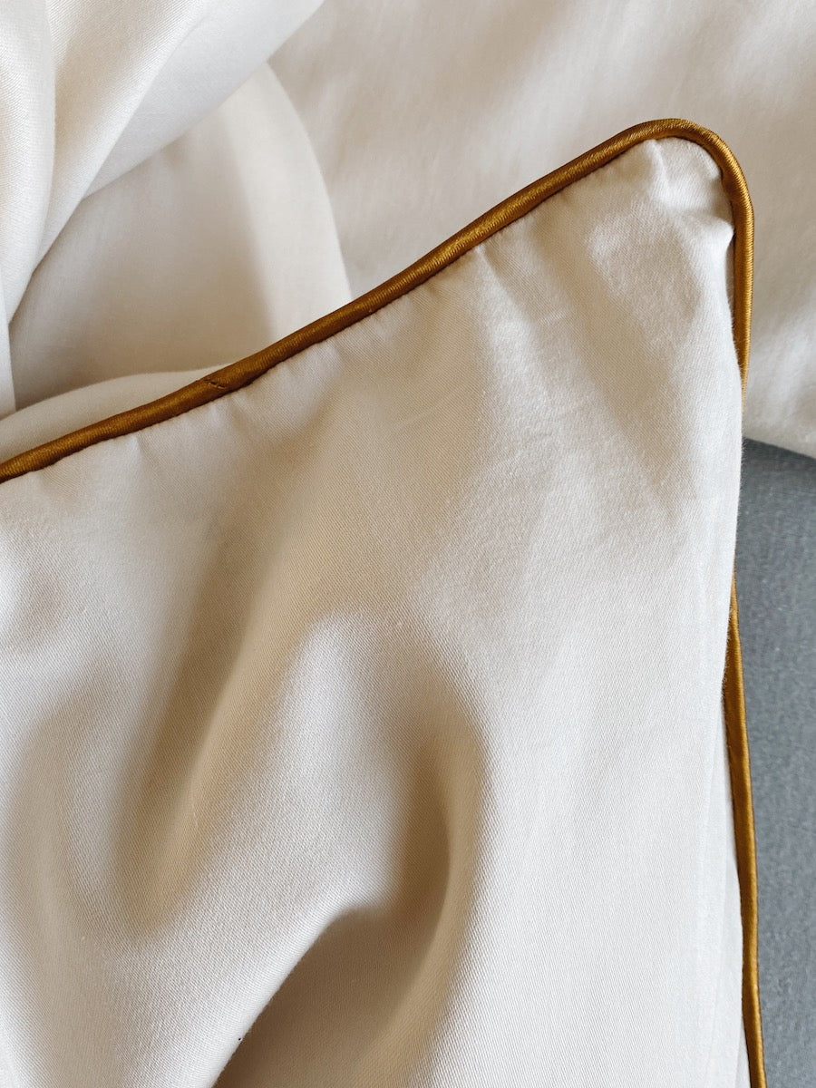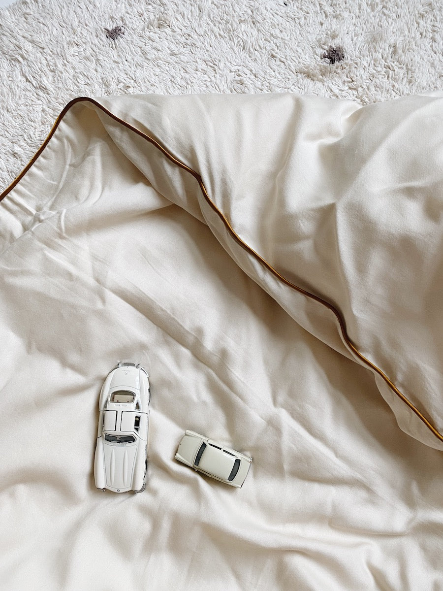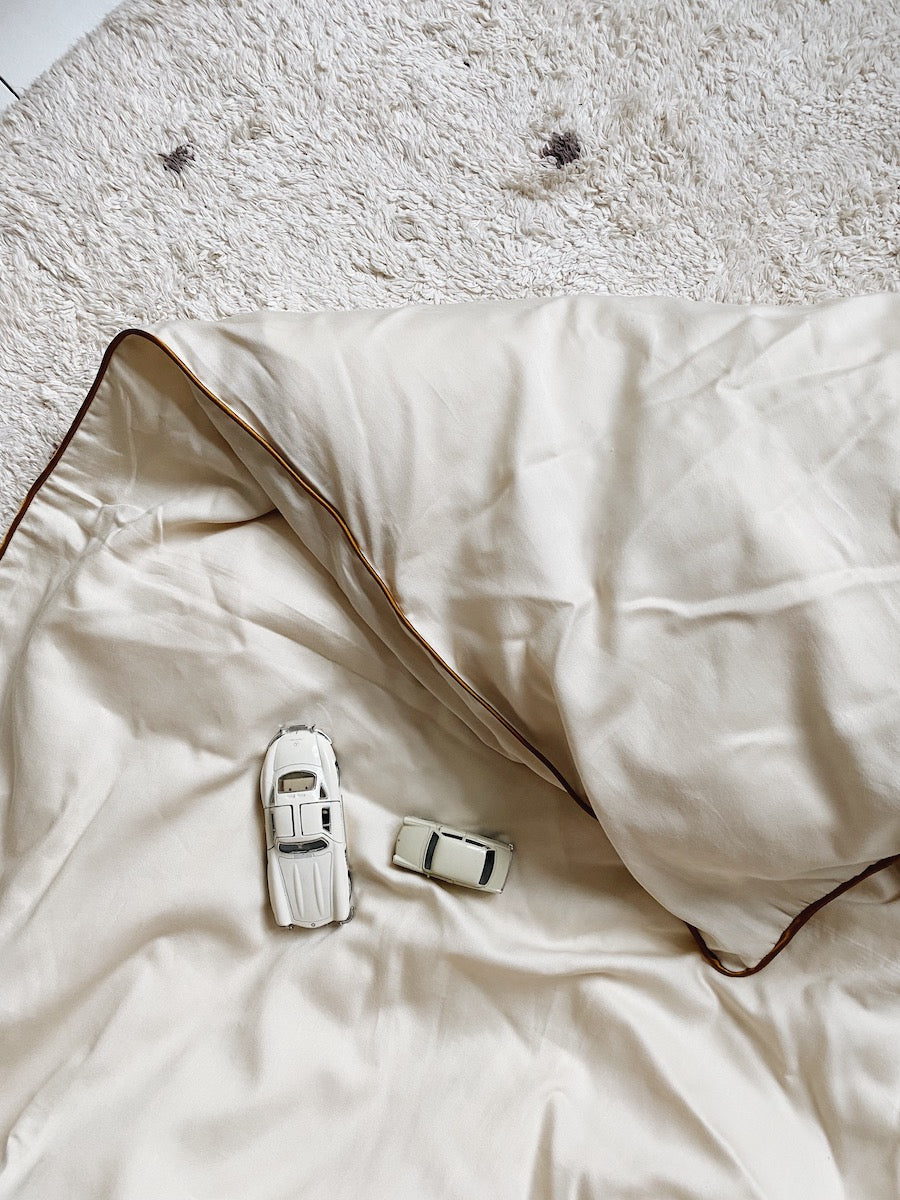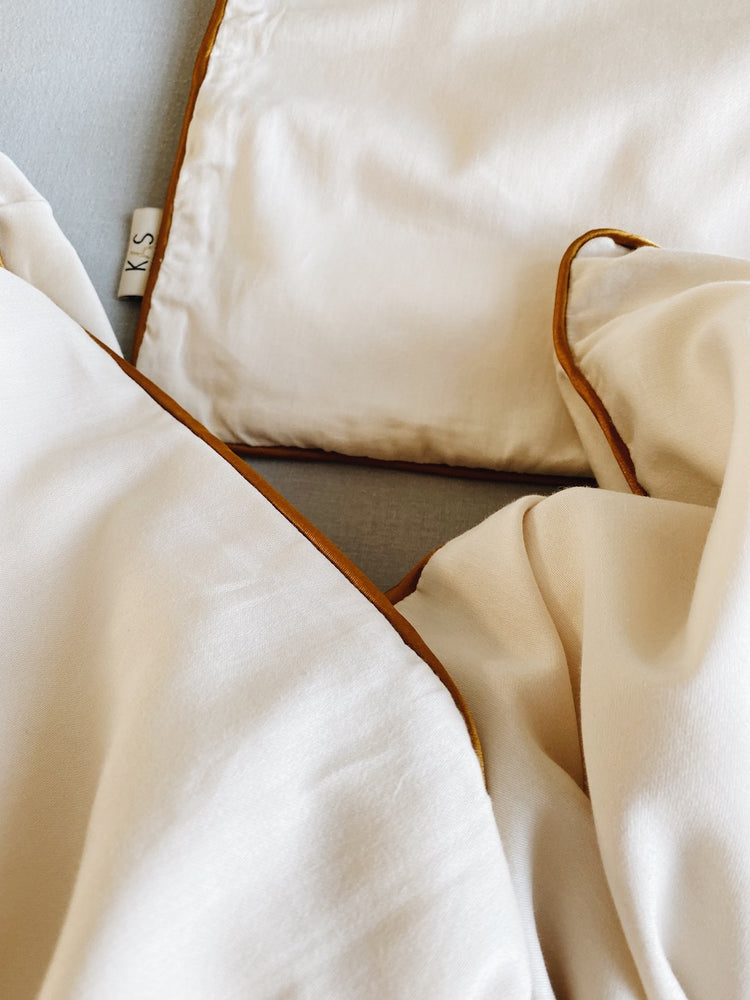 Rúmföt úr mjúkri lífrænni satínofinni bómull. Hvert sængurverasett er pakkað inn í samsvarandi poka.