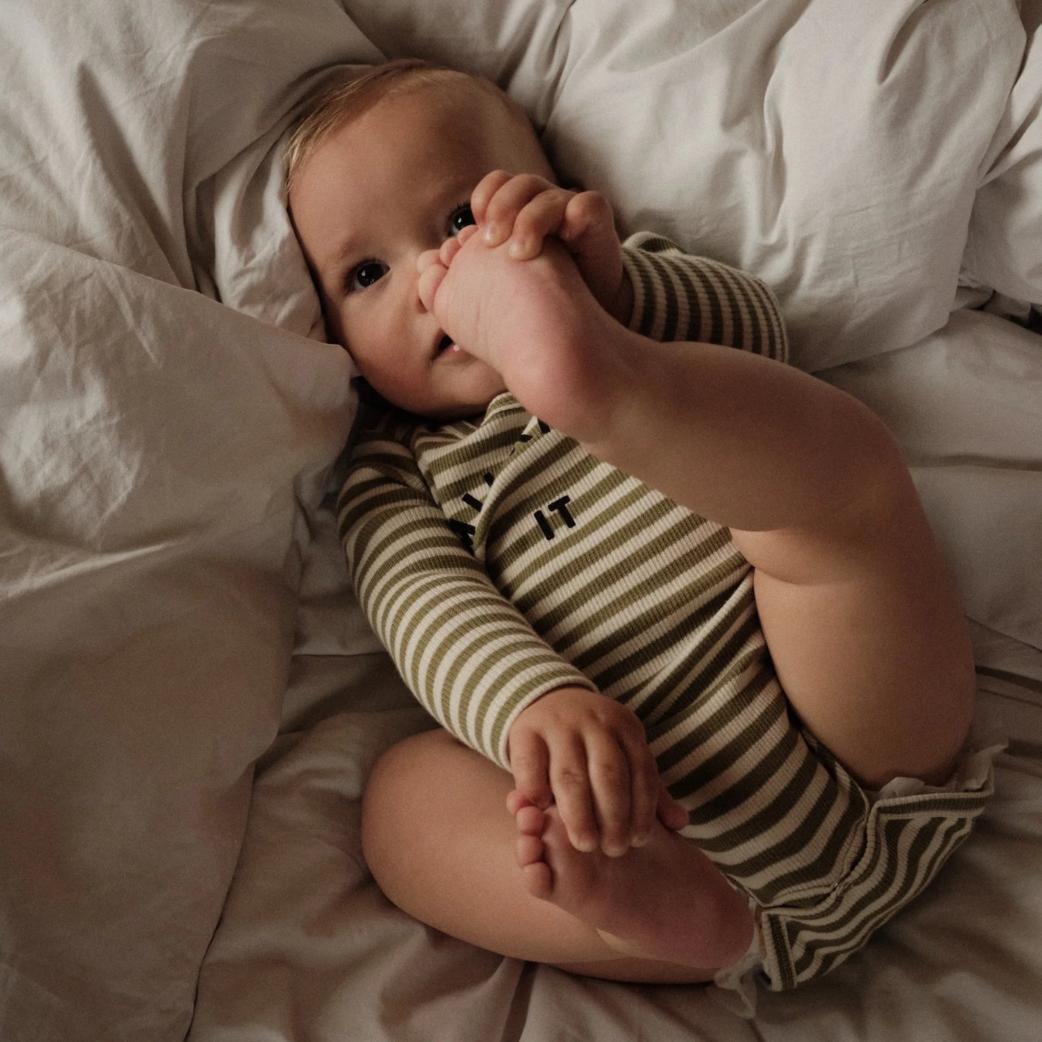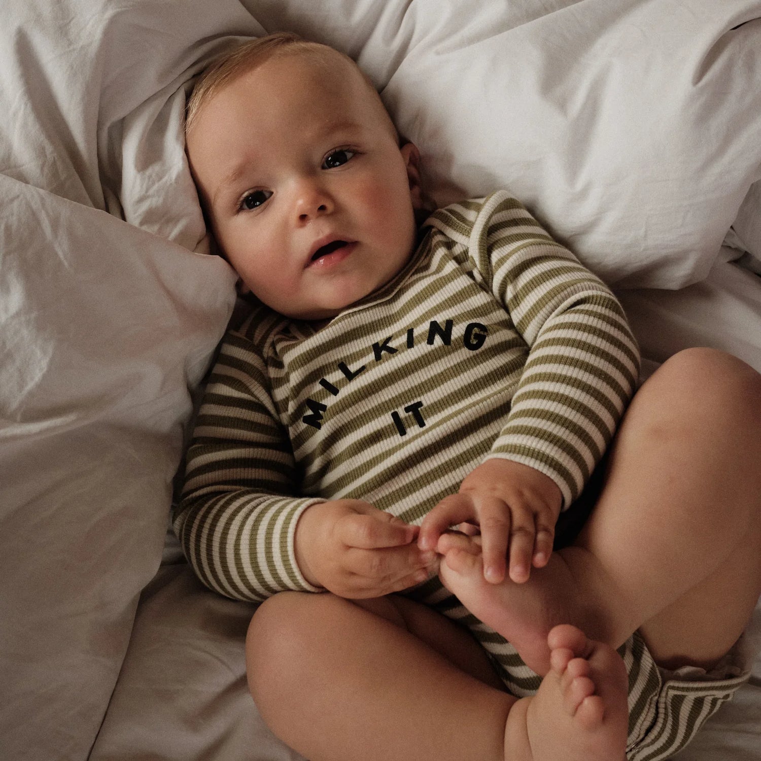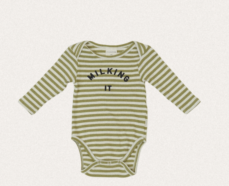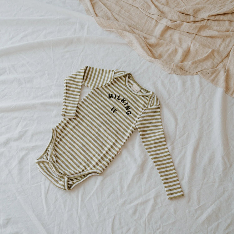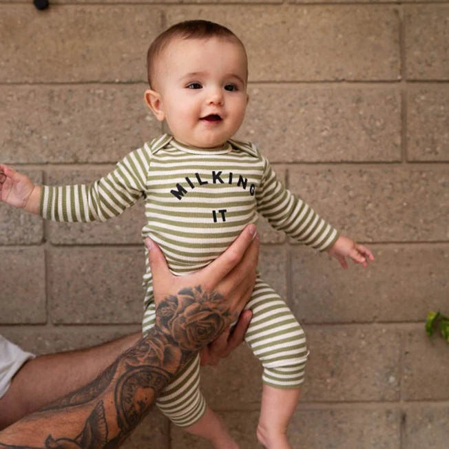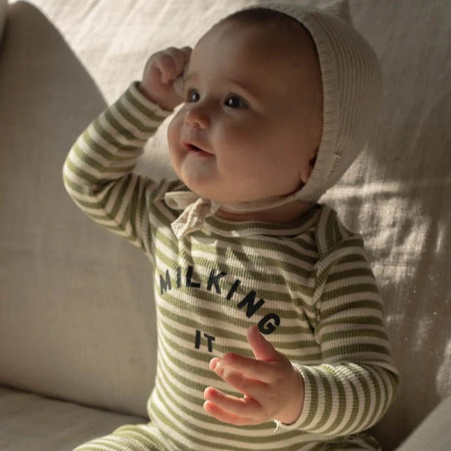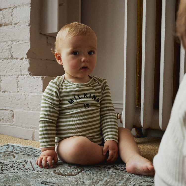 New Milking It Stripe Body is made with 97% organic cotton and 3% elastane rib for ultimate softness and stretch. The envelope neckline and popper fastening make it easy to change your little one. Unisex and stylish with a playful striped design. Comfort and convenience for both baby and parents. The best new addition to our iconic Milking It collection.
