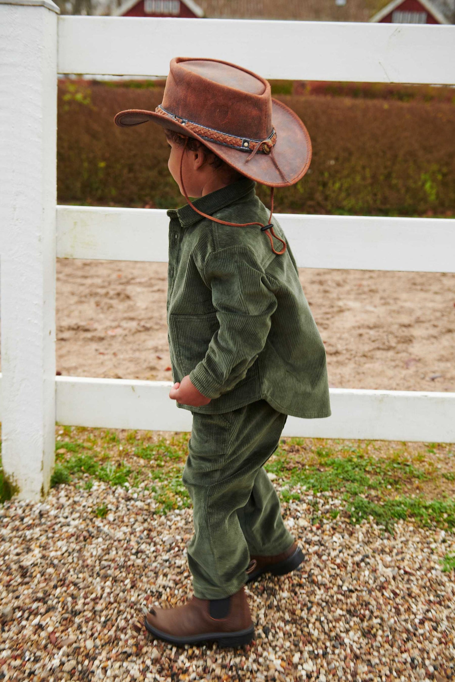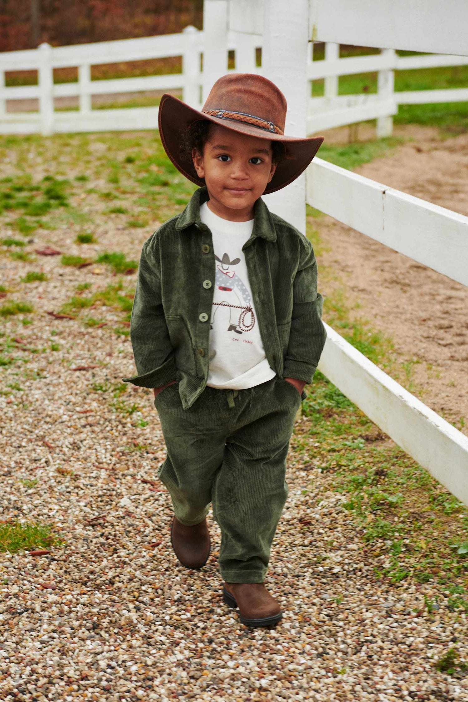 The corduroy shirt features a button-down front and a pocket on each side of the chest. The Western motif is embroidered.