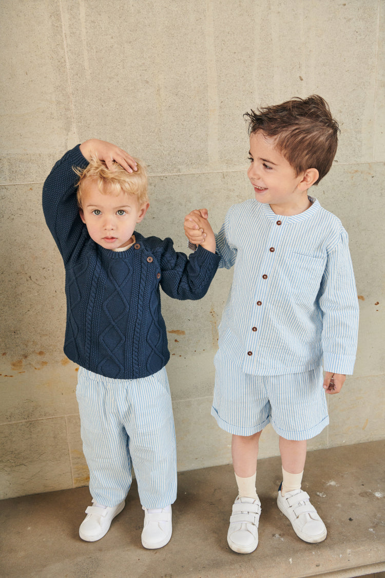 The jumper is made from 100% organic cotton sustainable buttons made of corozo nuts. The organic cotton makes it easy for your munchkin to acclimatize in every weather. And don't you worry - this sweater can easily be wash in the washing machine. Knitted with love, and perfect for flexible and easy movement.