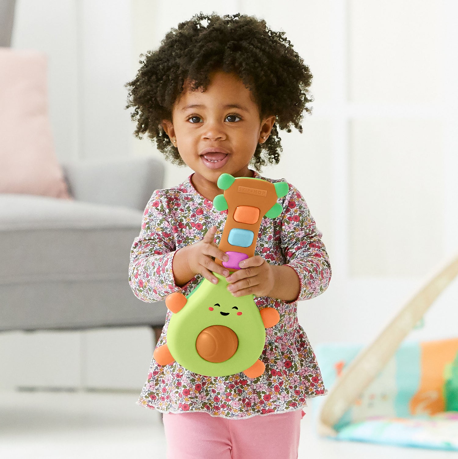 Rock out with the Farmstand Guitar Avocado from Skip Hop. An adorable avocado guitar that lets your mini musician play fun country riffs and fun songs. Spin the avocado core or press the colorful light-up buttons for great music. The guitar is easy for little hands to grip.