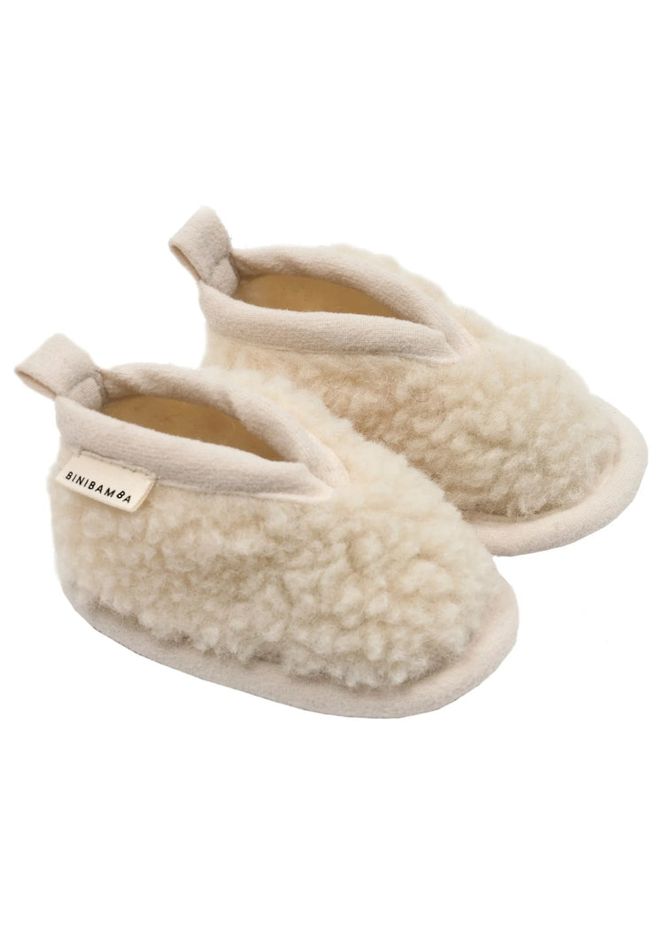 Cocooned & cosy... first steps never felt so good. Our merino, leather soled booties in MILK will have Binibabes walking on air.