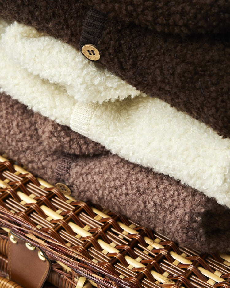 Með viðarhnöppum, hettu, hægt að bretta yfir ermar og fætur