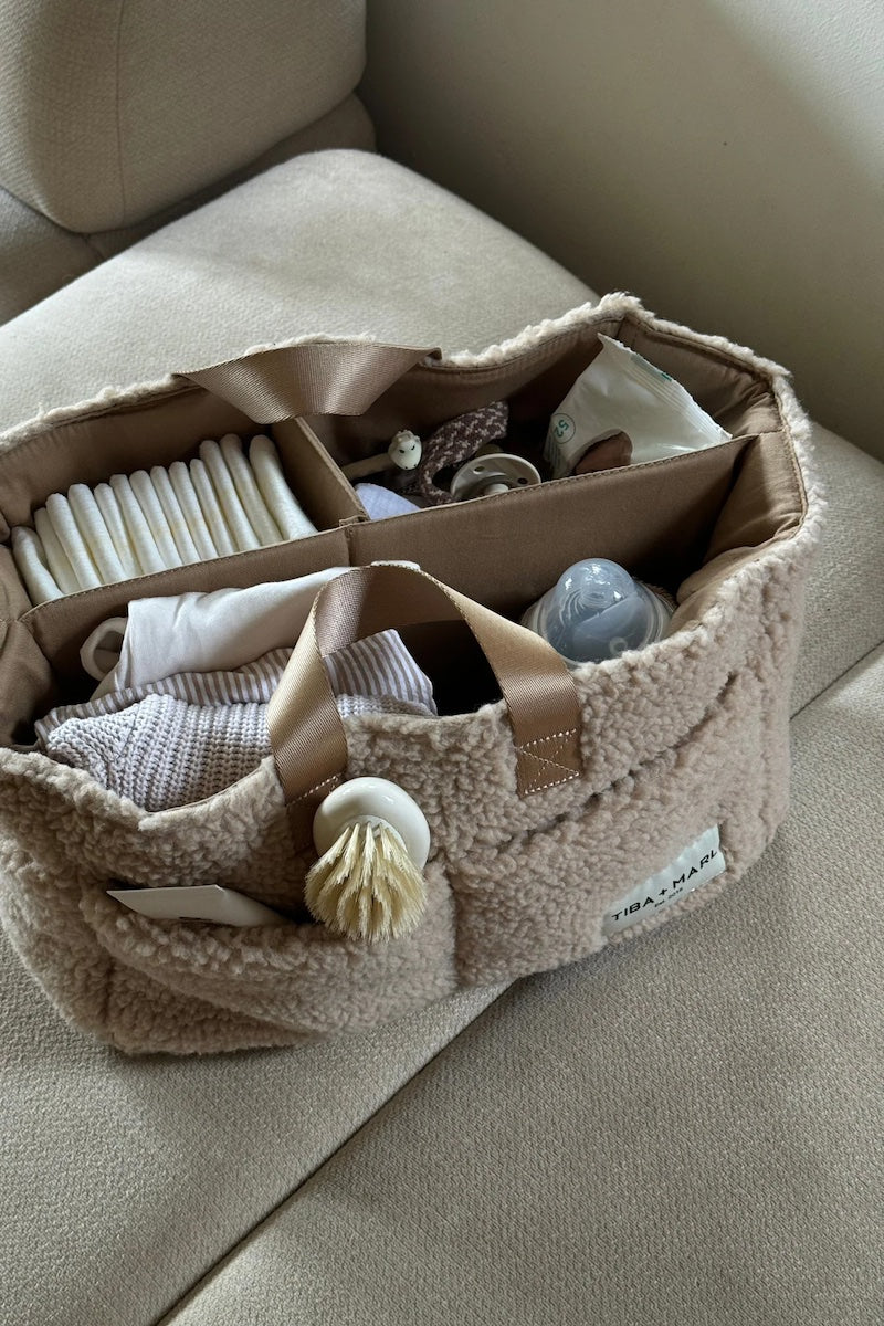 Useful, functional, essential. This sturdy changing caddy is crafted from tactile borg and features an insulated bottle holder that can keep bottles hot or cold for up to 3 hours (perfect for night feeds - just keep the caddy by the bed). No more scrambling for wipes and creams - with this caddy your nappy changing essentials will be neatly organized and portable so you can easily move your changing station from room to room (or house to car) as needed. This durable caddy is perfect for organizing your baby's clothing, toiletries or ensuring your most-used parenting items are always neatly stored and ready for use. Its structured form makes it ideal to slot under your buggy in the underseat basket ready for action, or used as a changing bag insert. With 6 external pockets, and 3 internal dividers, as well as a mesh slip pocket - there really is a space for everything. Co-ordinating item available: the T+M Pocket Tote has been designed so you can slot the caddy inside the tote. Utilising clever, modular design so you can double up function and carry your caddy in style