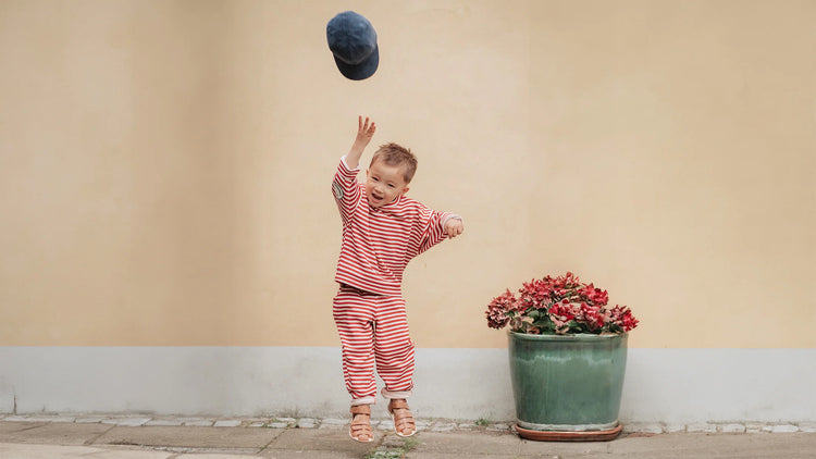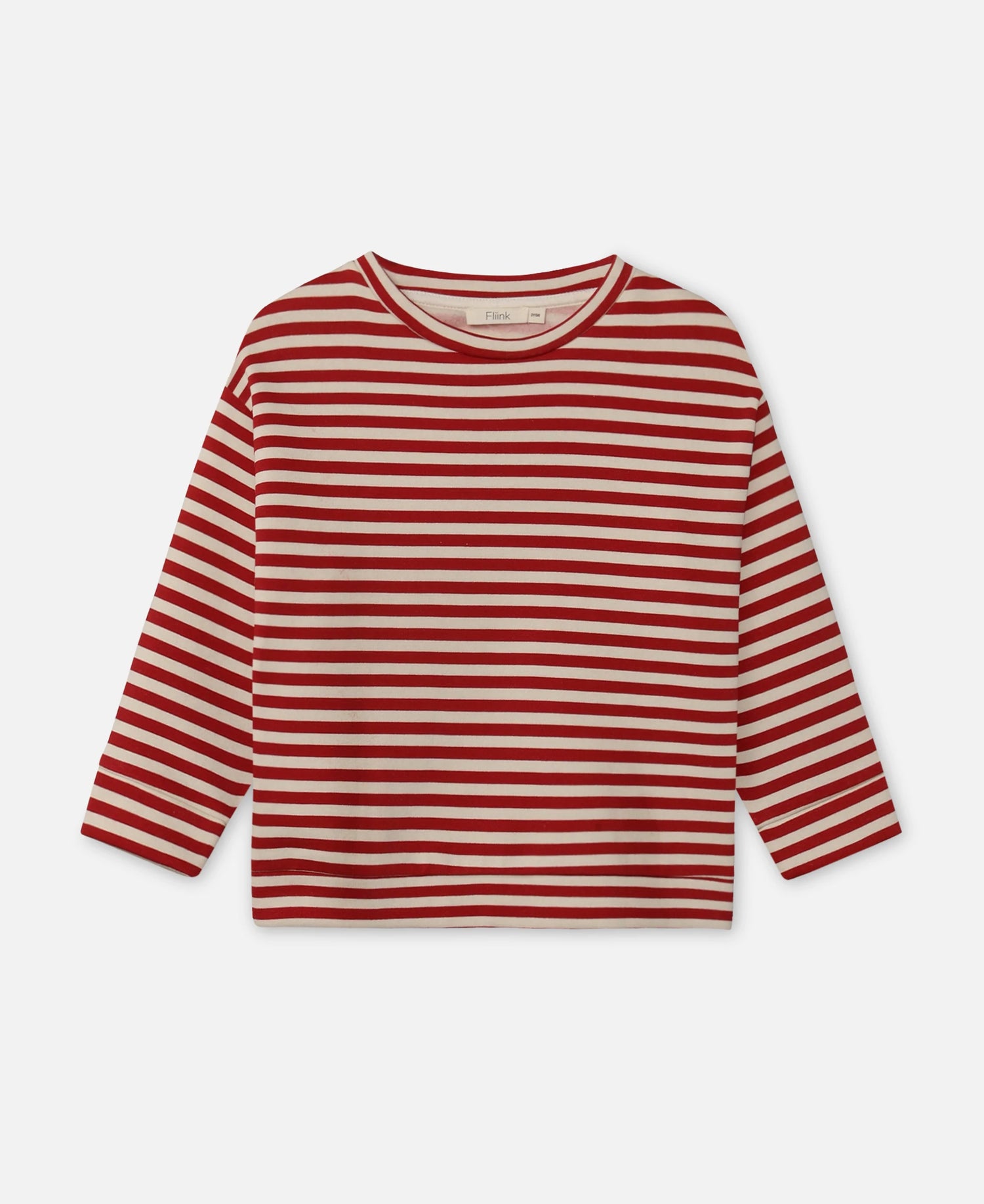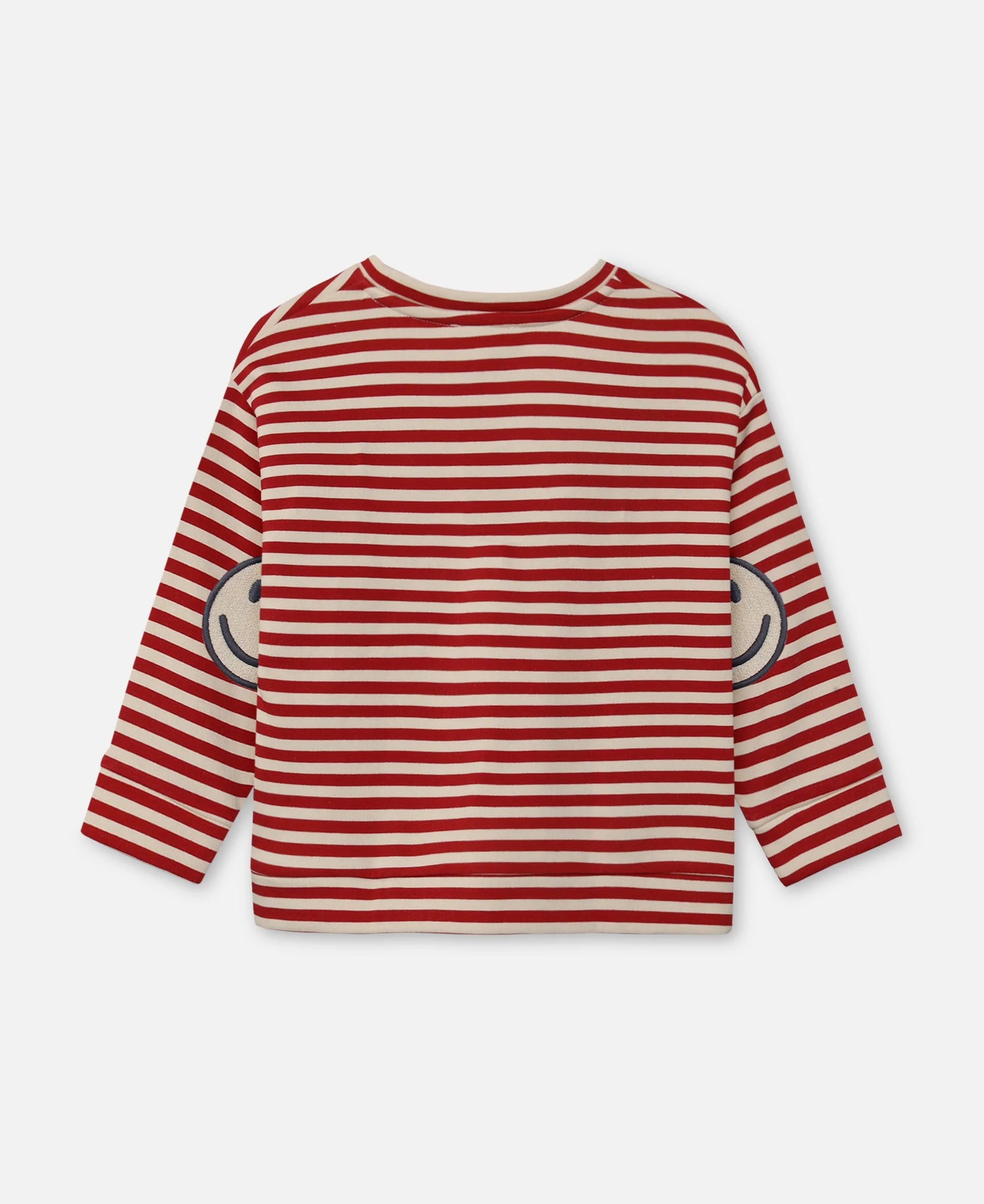 The sweater has stripes in red and sand, and on the elbows the sweater has an embroidered smiley face. The pullover is part of a set with ALVIN PANT with the same nice loose fit.