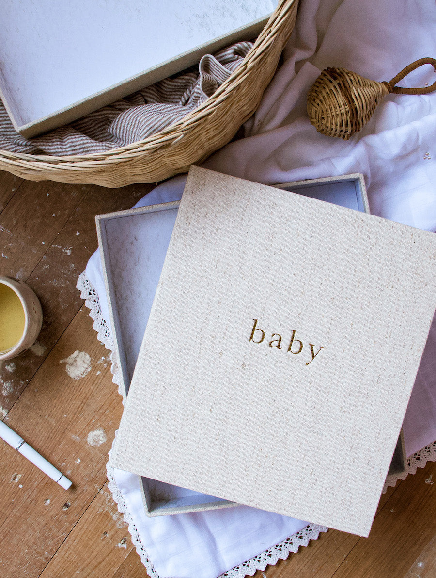 “Baby” comes presented in a luxurious matching linen box lined in matching end paper to the journal. It is bound in gold electroplate wire binding which allows for expansion to home many photos. The pages are also a high end 180GSM thick. |