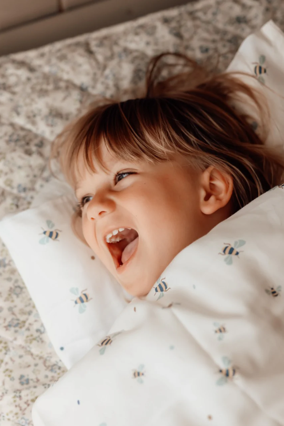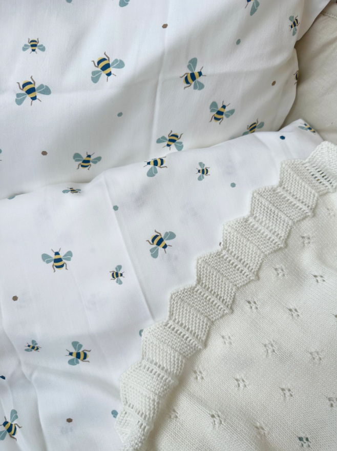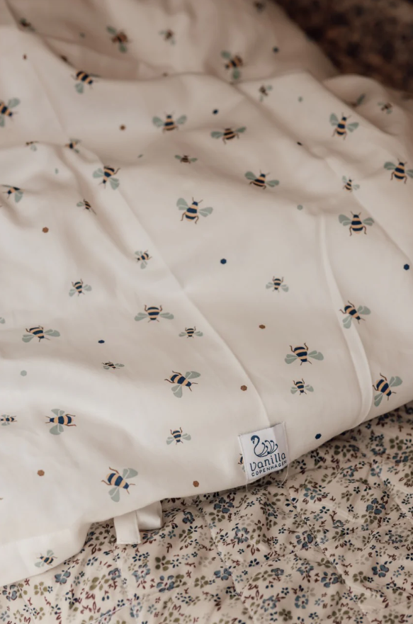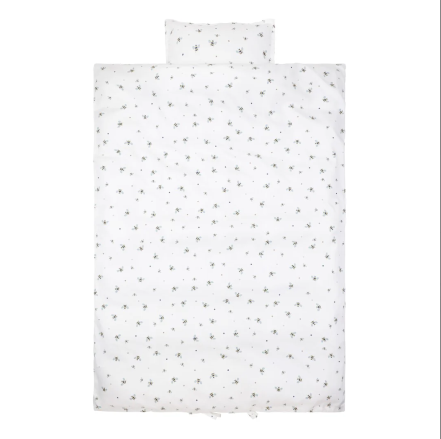Rúmföt með fínlegum útsaumi af lítilli sætri býflugu. Mjúku sængurverinu er lokað með böndum en koddaverið er með umslagslokun.