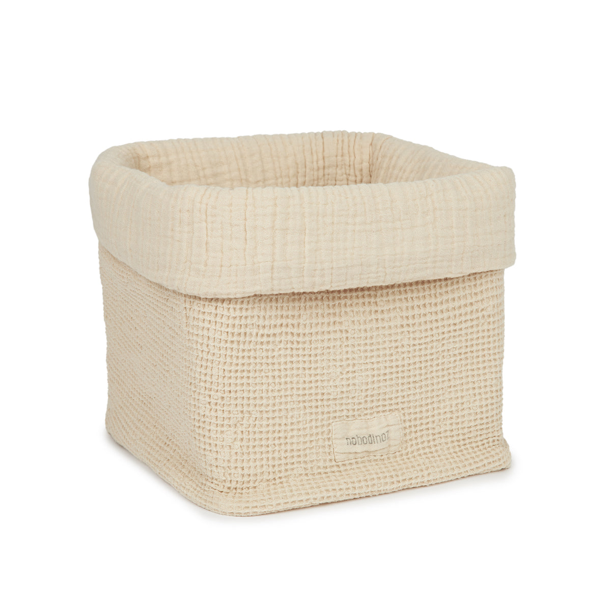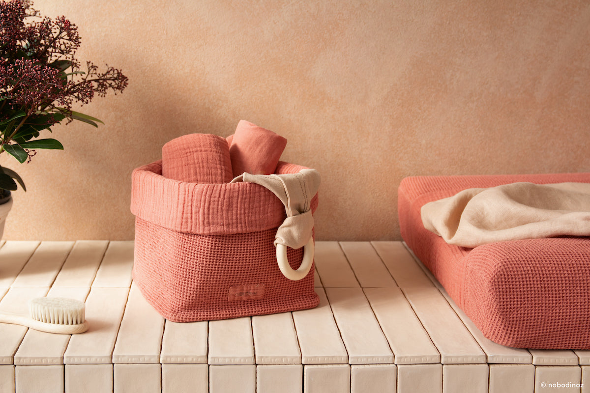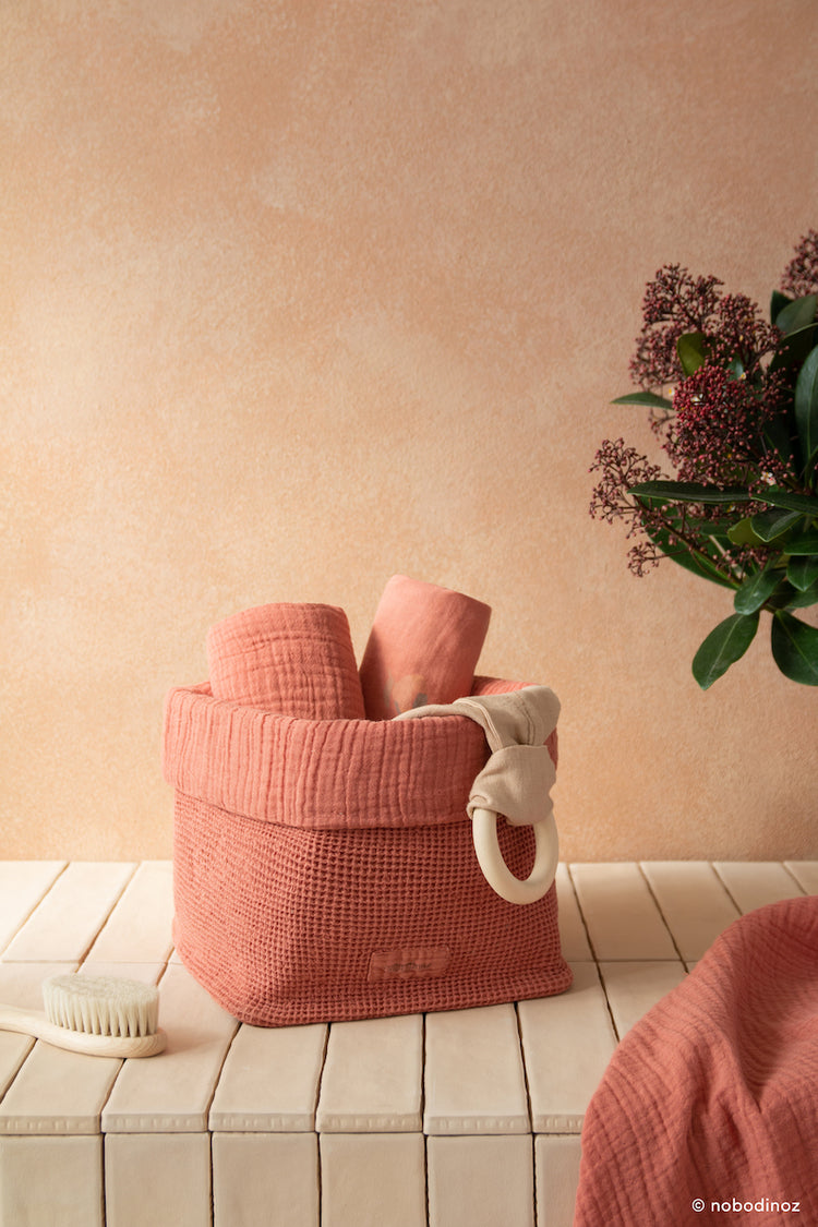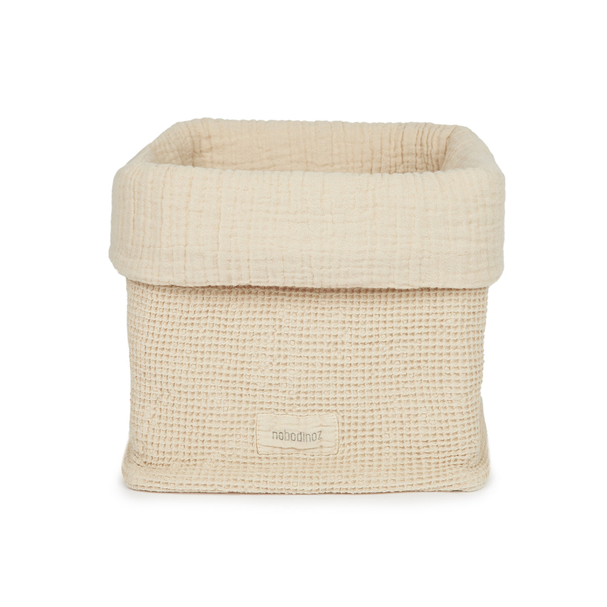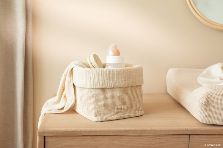 The Wabi-Sabi basket combines the elegance of honeycomb with the softness of the organic cotton double muslin. Ideal for storing small toys or accessories for baby's diaper change, it is the practical decorative element that is always needed.